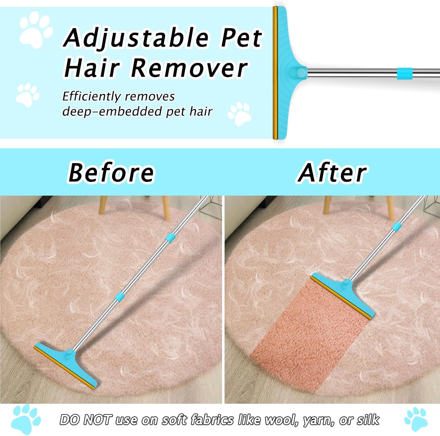 - Effectively Clean Embedded Pet Hair - The handle of the dog hair remover is made of 4 durable stainless aluminum sections, Length adjusts from 16.5 to 60 inches fits different heights and protect your back. The long adjustable handle dog fur remover reaches deep into the carpet, easy to reach under sofas and hygienic corners removes all of your beloved pet's hair.The Y-shaped cat fur remover designed to fit more scenarios