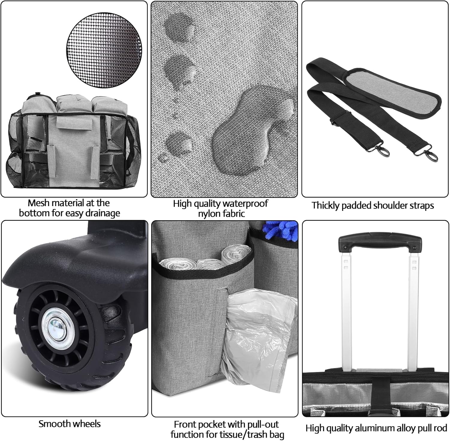 - Premium Quality Material: The Timoxi rolling cleaning caddy is made from high-quality nylon that is both waterproof and abrasion-resistant. The lining is made of aluminum foil, which is waterproof and easy to clean, and is very suitable for storing all kinds of cleaning agents.All four sides including the bottom are supported by 2mm hard plastic plates, which can bear a load of up to 30KG, so it is very sturdy even when the bag is empty. The size of the cleaning bag is 15.7''*11''*13''.