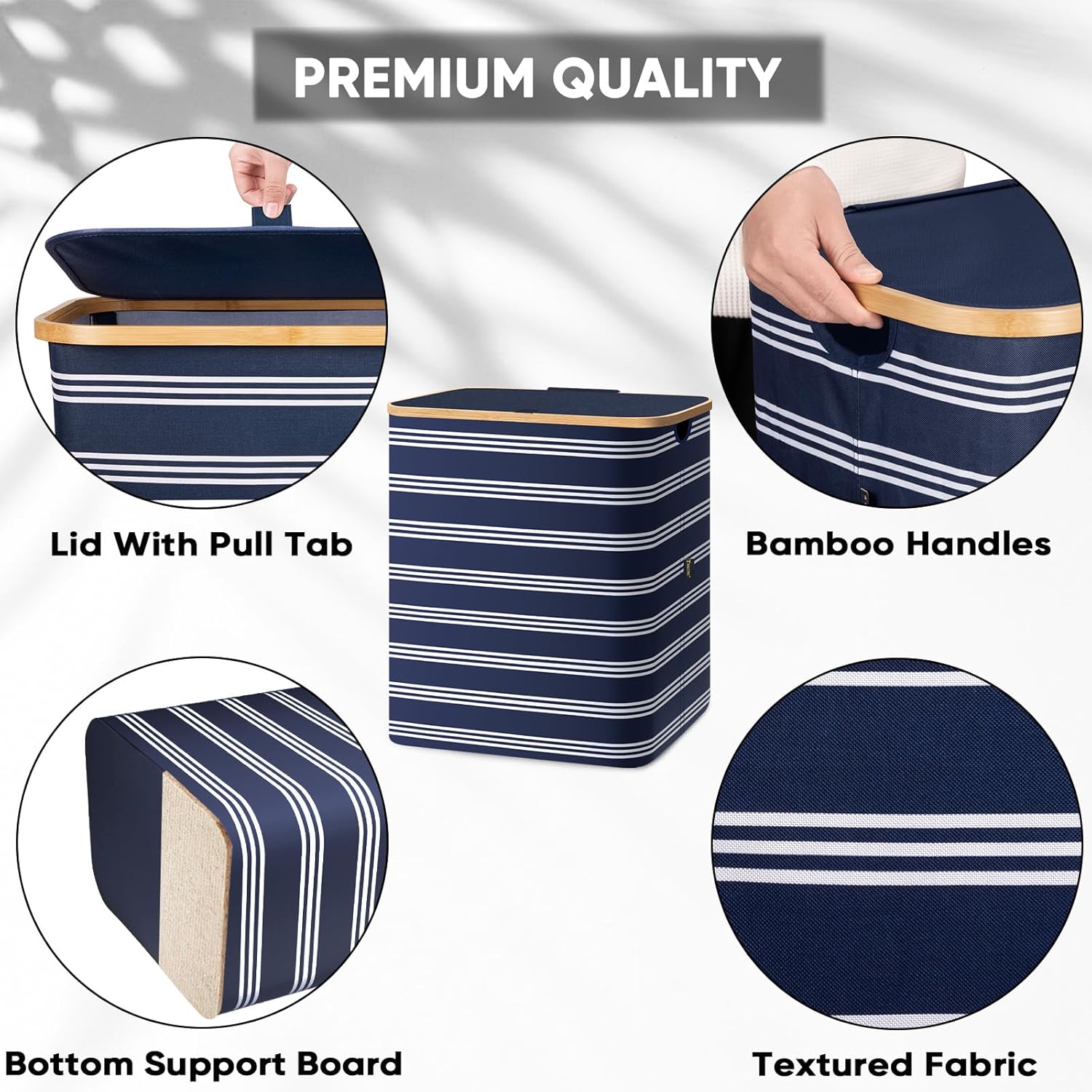 BALEINE Laundry Hamper with Lid, Tall Laundry Baskets with Bamboo Pull Handles, Large Laundry Bin with Internal Support (36 Gal/140L, Blue Pinstripe)