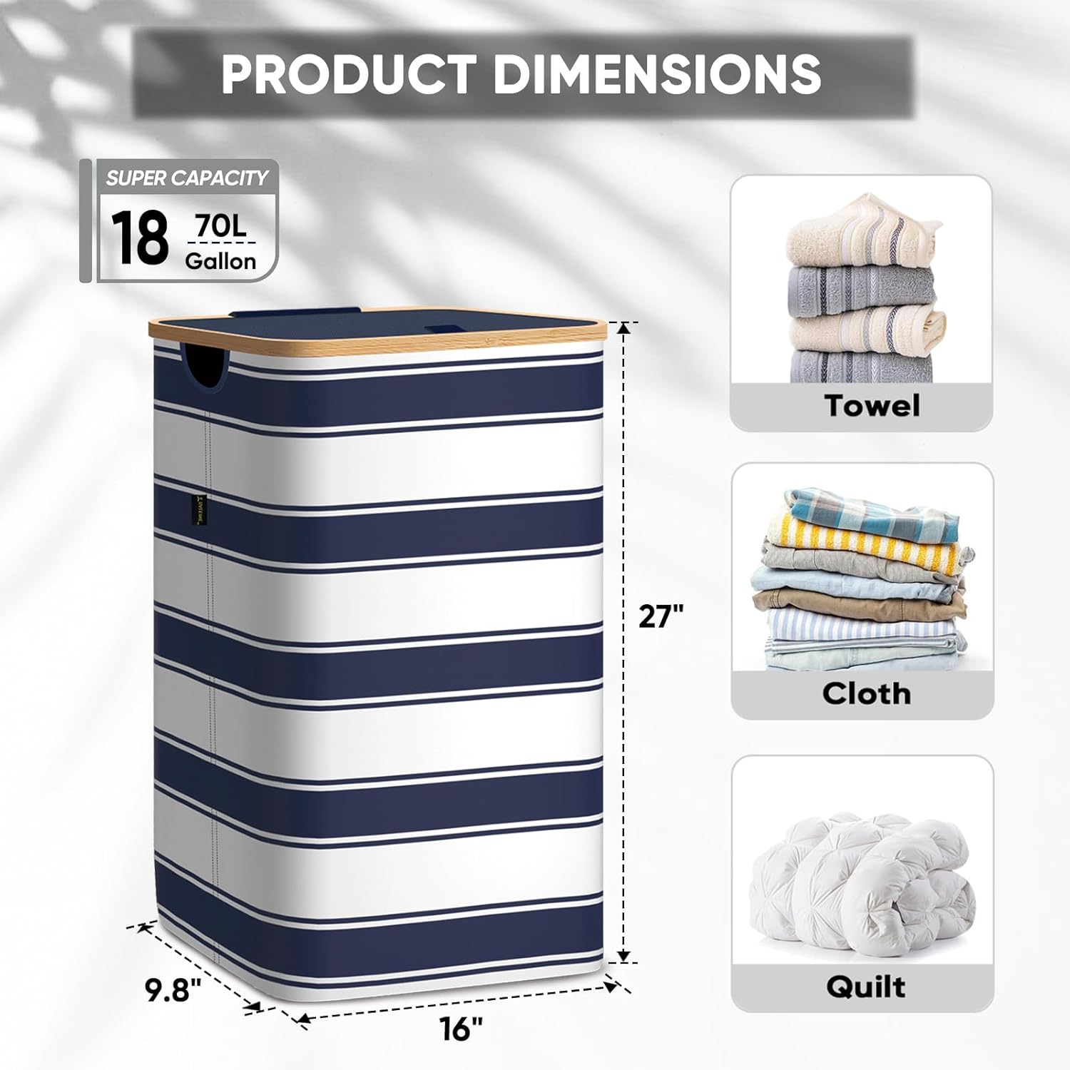 BALEINE Laundry Hamper with Lid, Tall Laundry Baskets with Bamboo Pull Handles, Large Laundry Bin with Internal Support (18 Gal/70L, Blue Stripe)