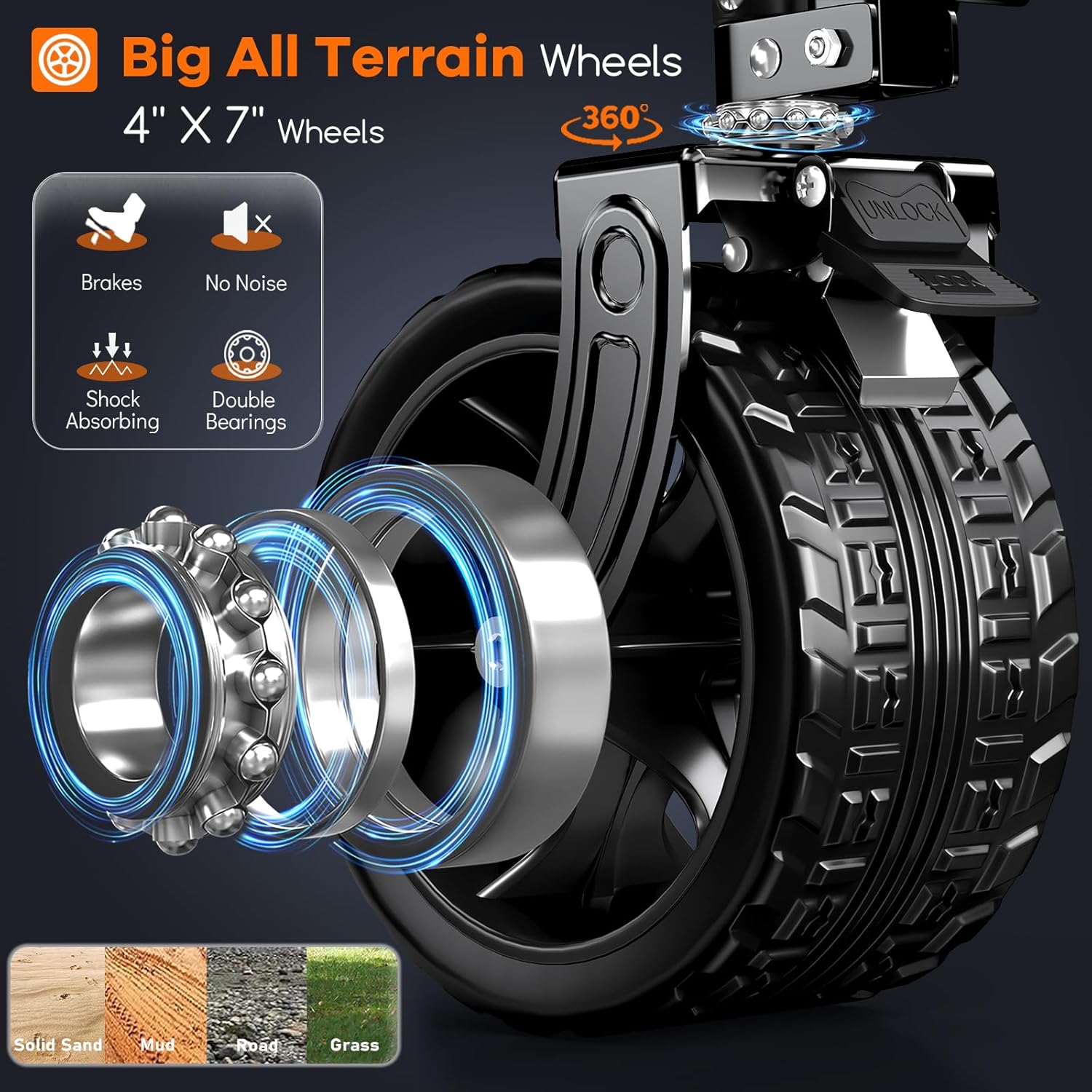 - ใ๐ฏ๐ฒ๐ฌยฐ๐ฅ๐ผ๐๐ฎ๐๐ถ๐ผ๐ป ๐จ๐ป๐ถ๐๐ฒ๐ฟ๐๐ฎ๐น ๐๐น๐น-๐๐ฒ๐ฟ๐ฟ๐ฎ๐ถ๐ป ๐๐ถ๐ด ๐ช๐ต๐ฒ๐ฒ๐น๐ ๐๐ถ๐๐ต ๐๐ฟ๐ฎ๐ธ๐ฒ๐, ๐ฆ๐๐ถ๐๐ฎ๐ฏ๐น๐ฒ ๐ณ๐ผ๐ฟ ๐ฉ๐ฎ๐ฟ๐ถ๐ผ๐๐ ๐ฅ๐ผ๐ฎ๐ฑ ๐ฆ๐๐ฟ๐ณ๐ฎ๐ฐ๐ฒ๐ใThis beach carts features 4 larger and wider 7"x4" double bearings all-terrain big wheels, allowing for flexible steering and smooth rolling on various road surfaces such as mud, grass, and hard sand. The two 360ยฐ rotation front wheels with brakes, effectively to stop and prevent the wagon from moving. It' s shock-absorption and noise-reduction, ensuring durability and resistance to wear and tear.