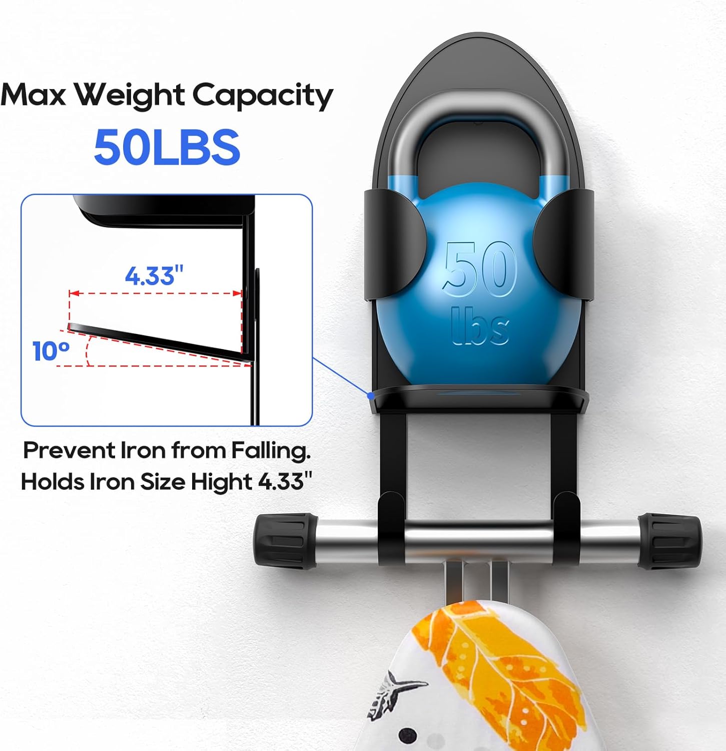 - DIMENSIONS AND LOADING: The holder’s usable space is 6.96 x 4.33 x 15.88 inch. Detachable hook feature is 2.16 inch wide. The ironing board holder supports up to 66 lbs of weight. Suitable for large iron and ironing board.