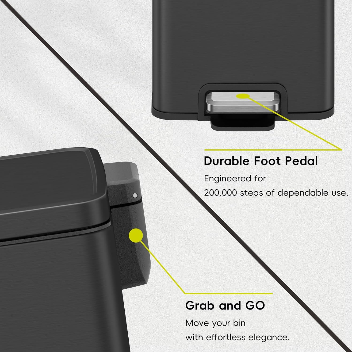 - Premium Steel Pedal - Step up to a new level of durability with our enhanced pedal. Our step trash cans' durable stainless steel foot pedal is built to last over 200,000 times, giving you decades of reliable use!