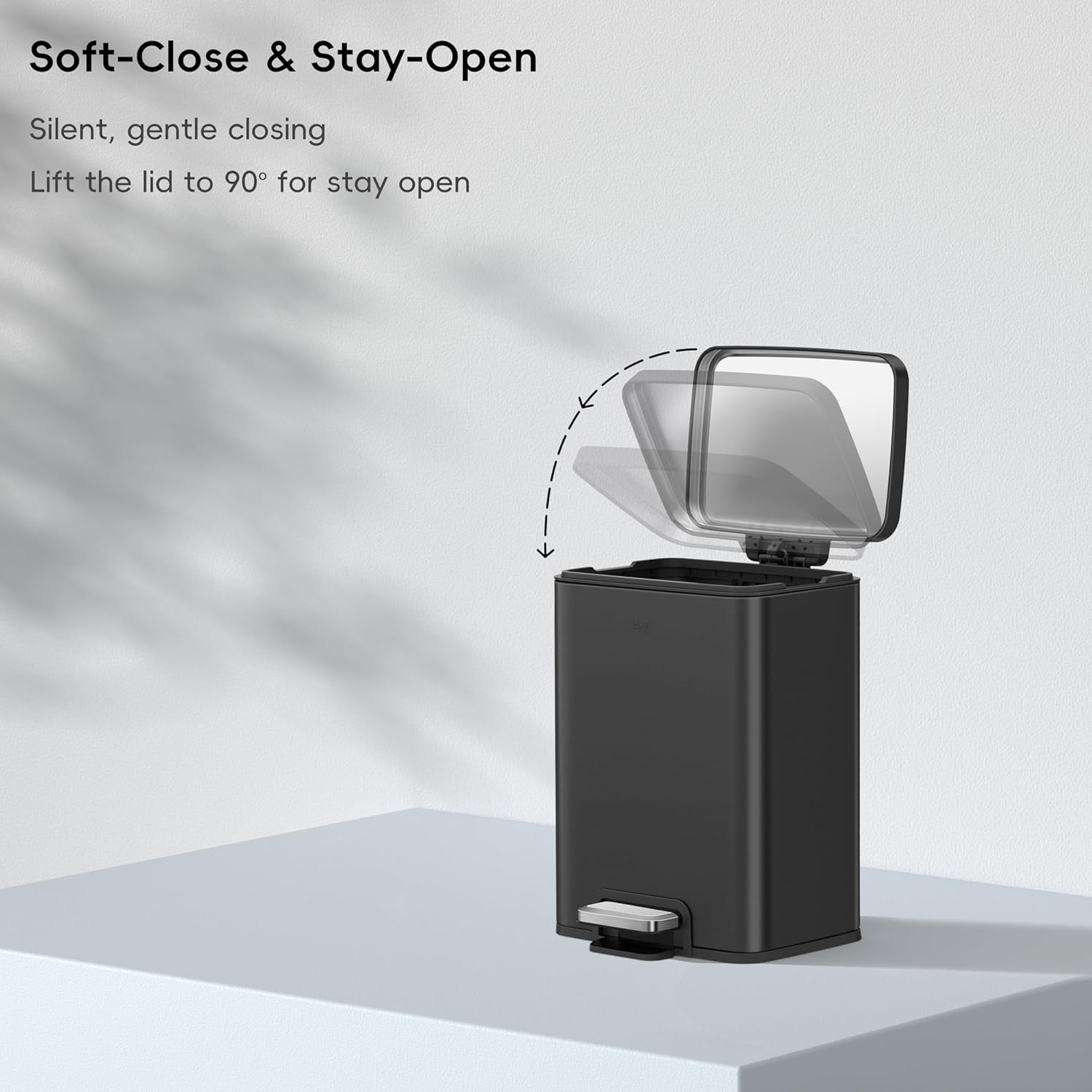 EKO Madison Matte Black 6L / 1.6 Gal Bathroom Trash Can with Lid and Removable Inner Basket, Rectangular Small Step Trash Can, Brushed Stainless Steel