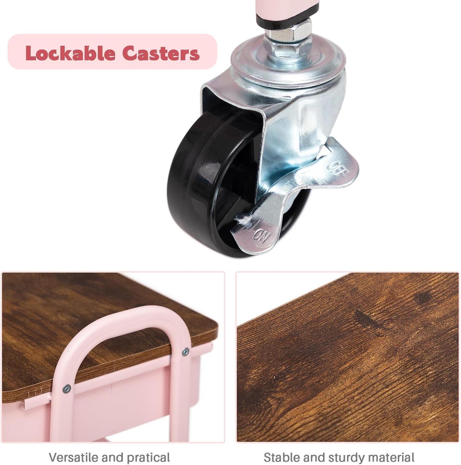 AGTEK Makeup Organizer Cart with Drawer, 3-Tier Metal Utility Cart with Hanging Cups, Leather Handle, Mobile Trolley for Home & Office, Pink