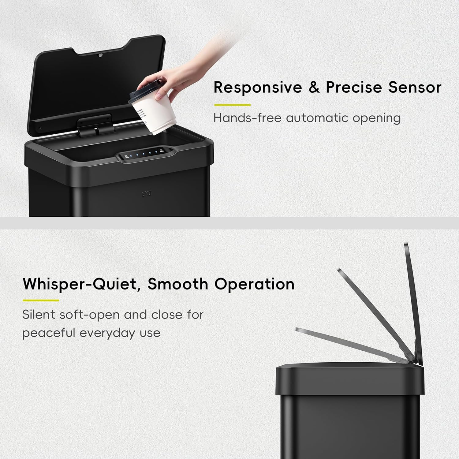 - Premium Motion Sensor Technology - Experience the smoothest, most seamless lid opening and closing technology with this EKO hands-free automatic trash can.
