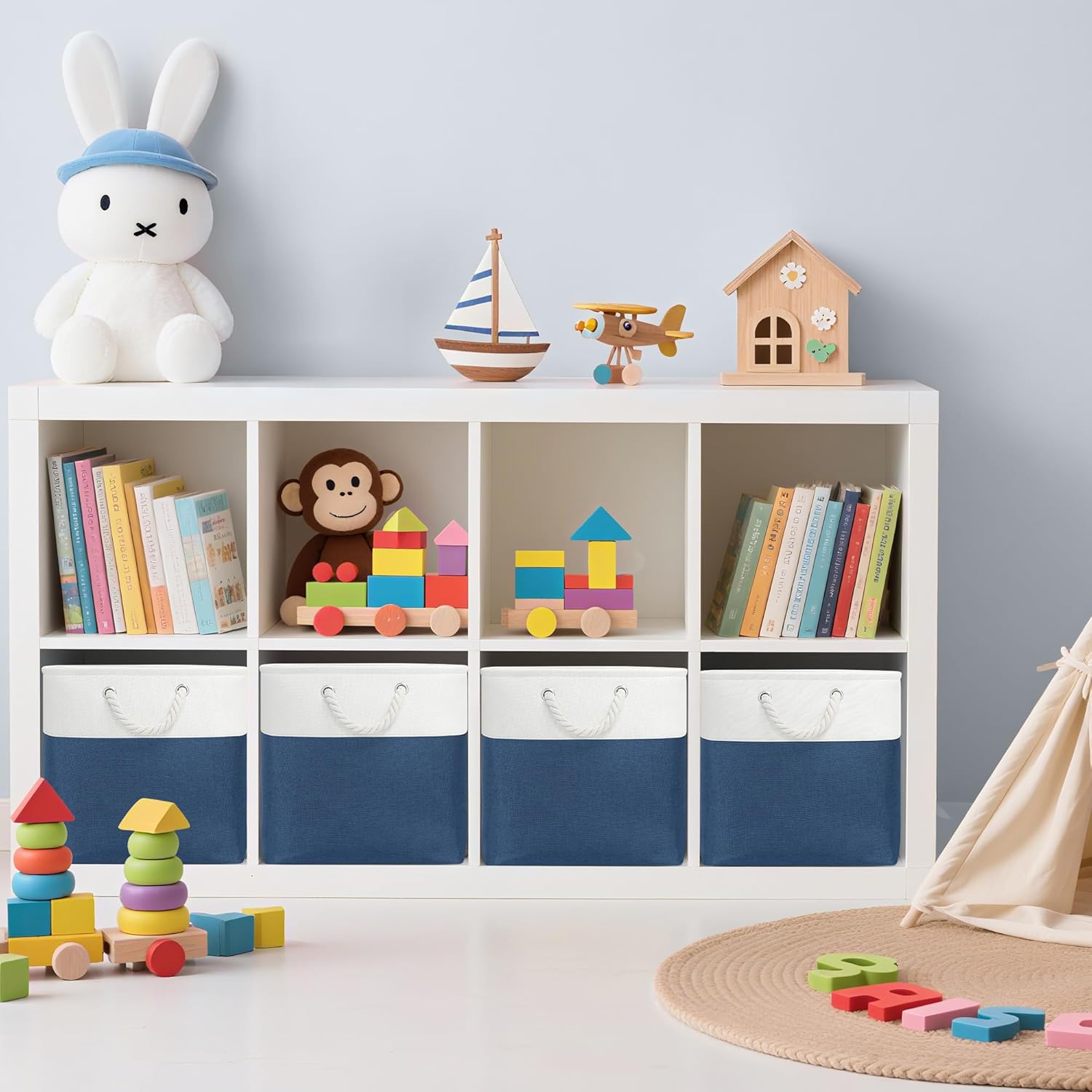 13x13 Inch Cube Storage Bins with Reinforced Bottom Cardboard, 6 Pack Large Collapsible Fabric Storage Cubes with Handles for Shelf, Closet, Toy, Laundry Organization (White&Navy Blue)