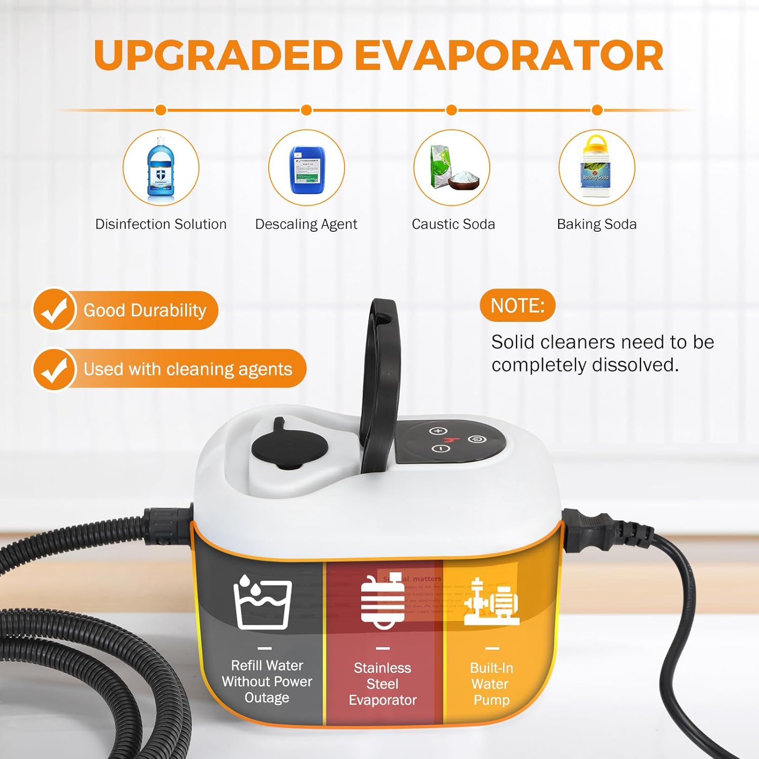 - **Portable & Flexible: Lightweight with a convenient handle for easy maneuverability. Long water tube, power cord, and explosion-proof steam pipe provide a wide cleaning range.