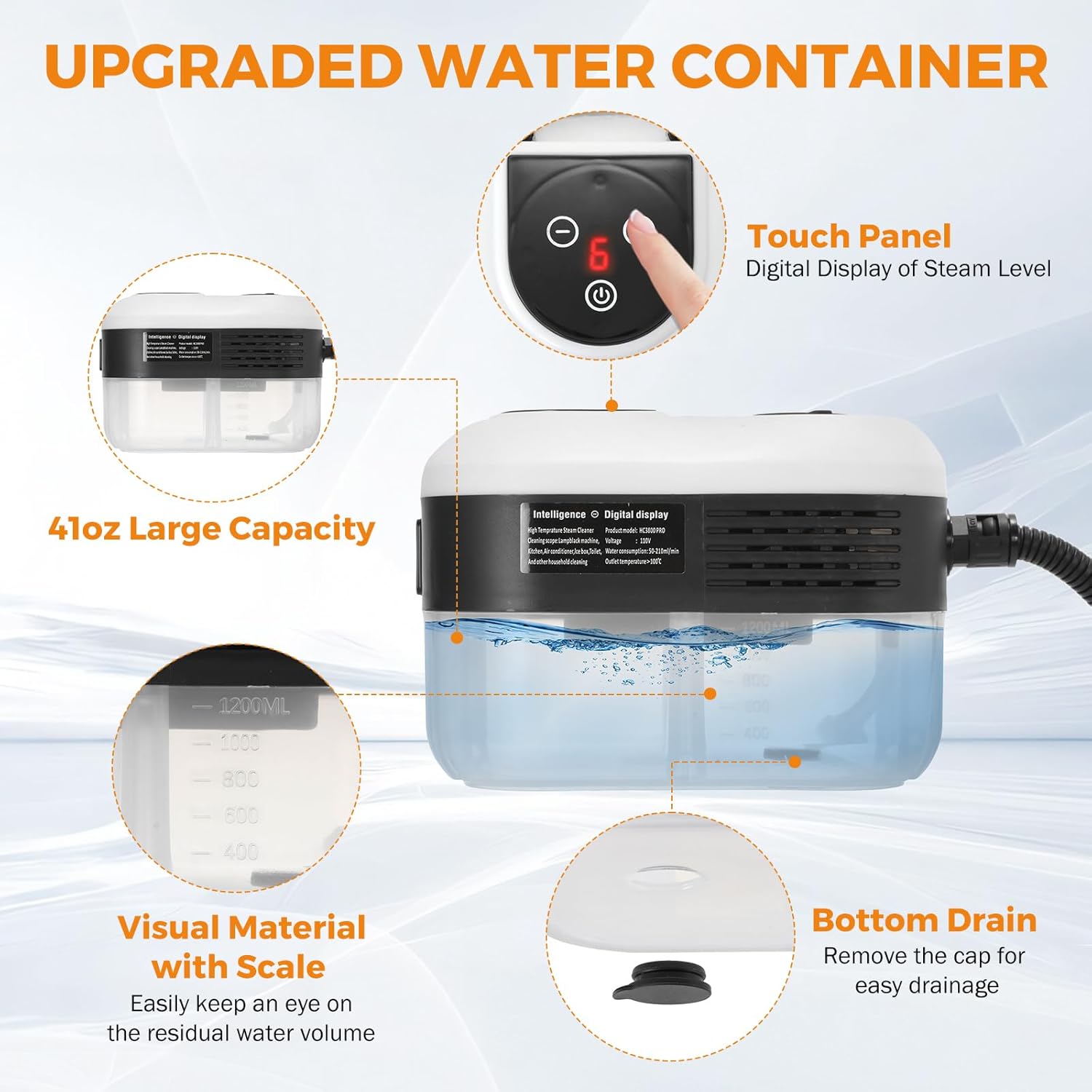 - **Easy Operation: Simply fill the 1.2L (41oz) water container, turn on the switch, and control steam output via touch panel or steam gun button. Features an LED digital display for precise control.