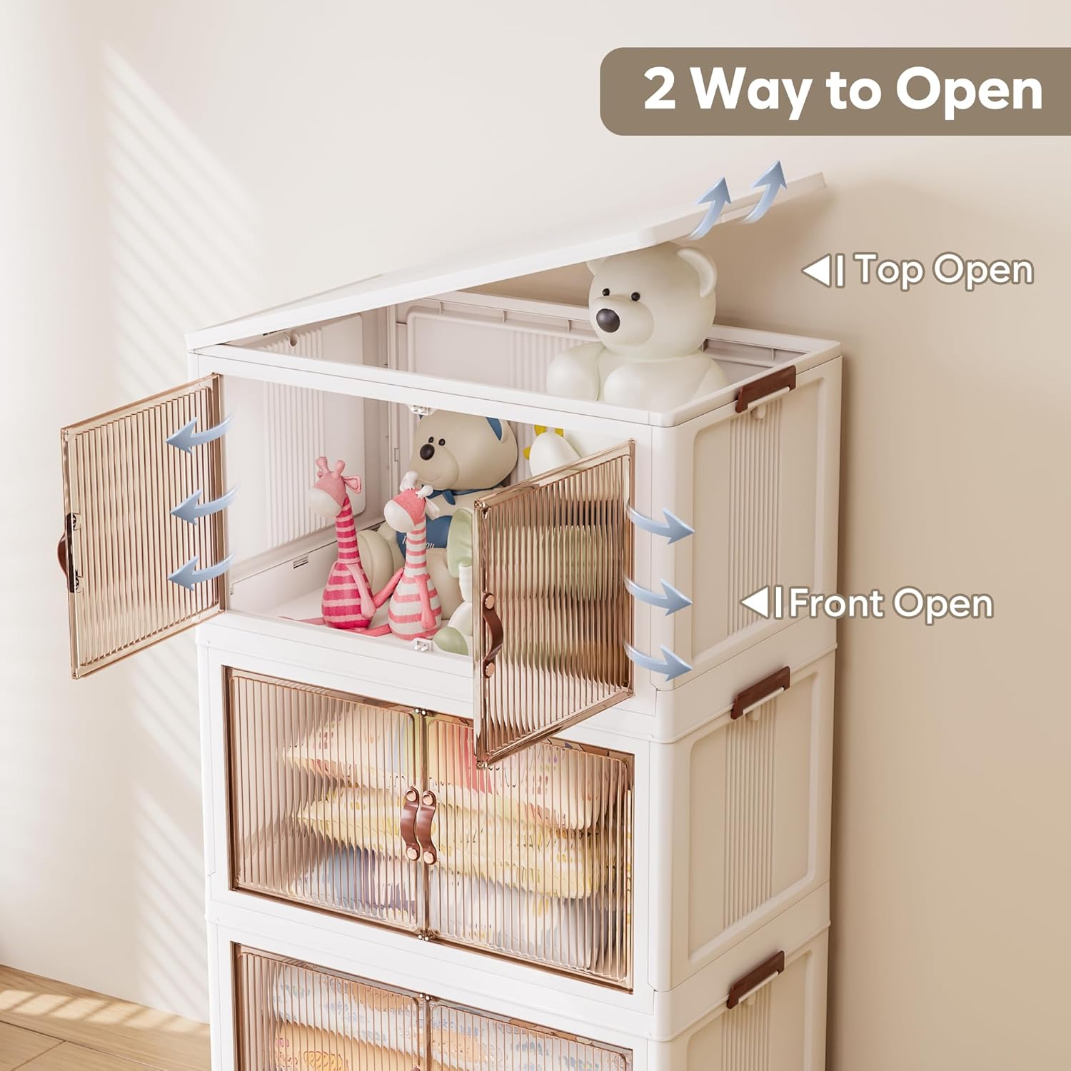 - 【Two Way Open】The bins feature front double doors or top lid openings. The magnetic lock provides easy access to the front, while the top lid allows for easy access to larger items like clothes and blankets. These bins are perfect for storage bins with drawers to enhance organization and storage.