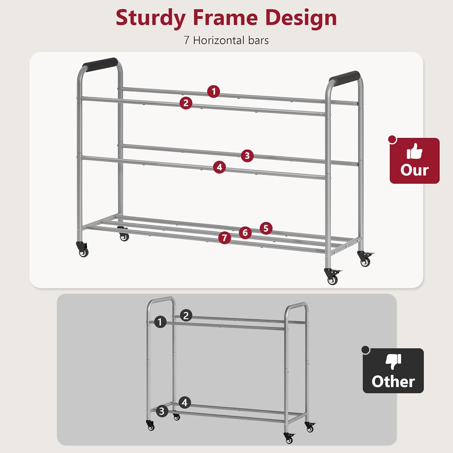 - 【Sturdy Metal Frame】Made of high-quality metal, it has good load-bearing performance. 7 metal horizontal bars make the rolling laundry basket frame more stable, and the horizontal bars at the bottom of the laundry sorter hamper prevent the bags from sagging when loading clothes.