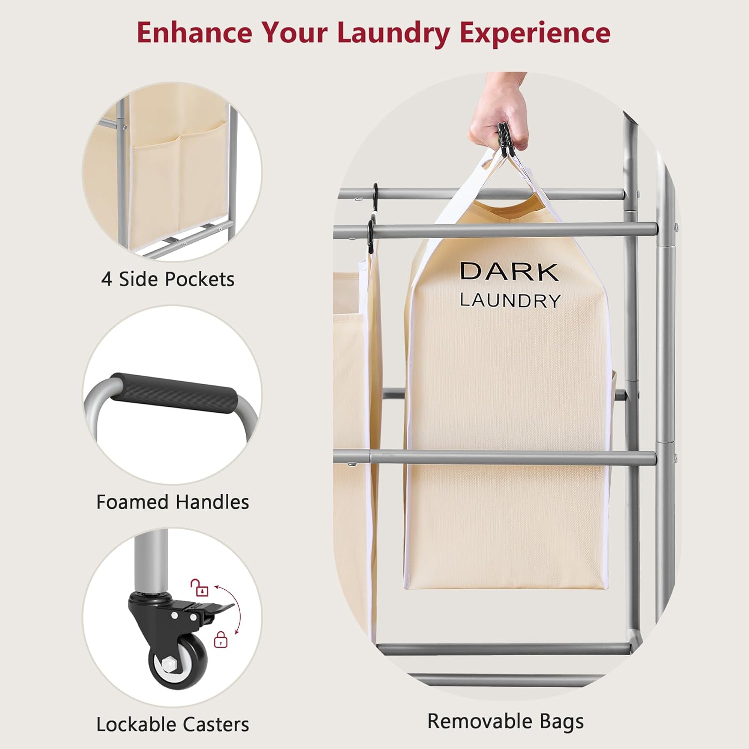 - 【Removable Laundry Bags】The laundry hamper with wheels comes with 5 laundry bags to sort your clothes by color or type, simply use the two metal handles to remove the laundry bags individually from the laundry sorter cart.