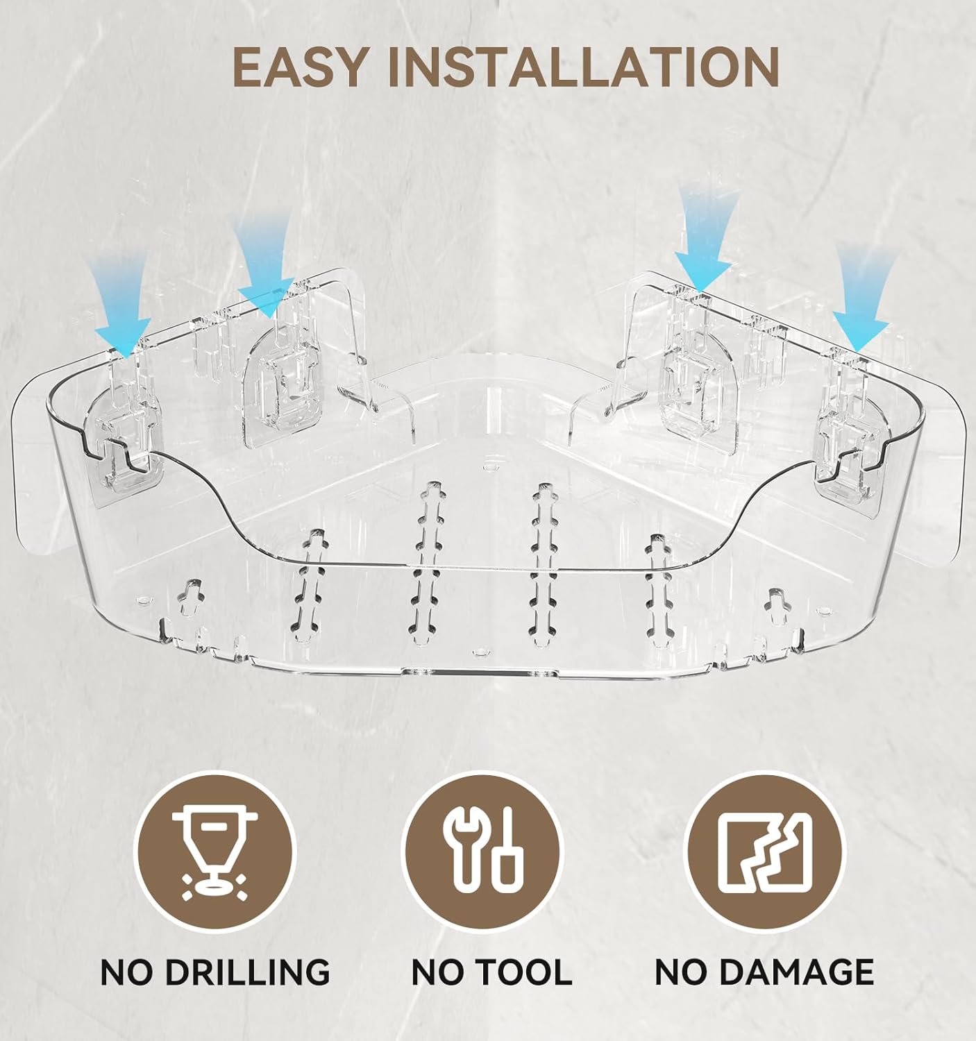 - Easy Installation: No drilling, easy to install and remove. Locate the 90° corner of the wall, clean and keep it dry, hang the shower corner shelves on the backing sticker and let it sit for 24 hours before placing items. NOTE: This shower caddy fits in 90° corners, not rounded or curved corner spaces