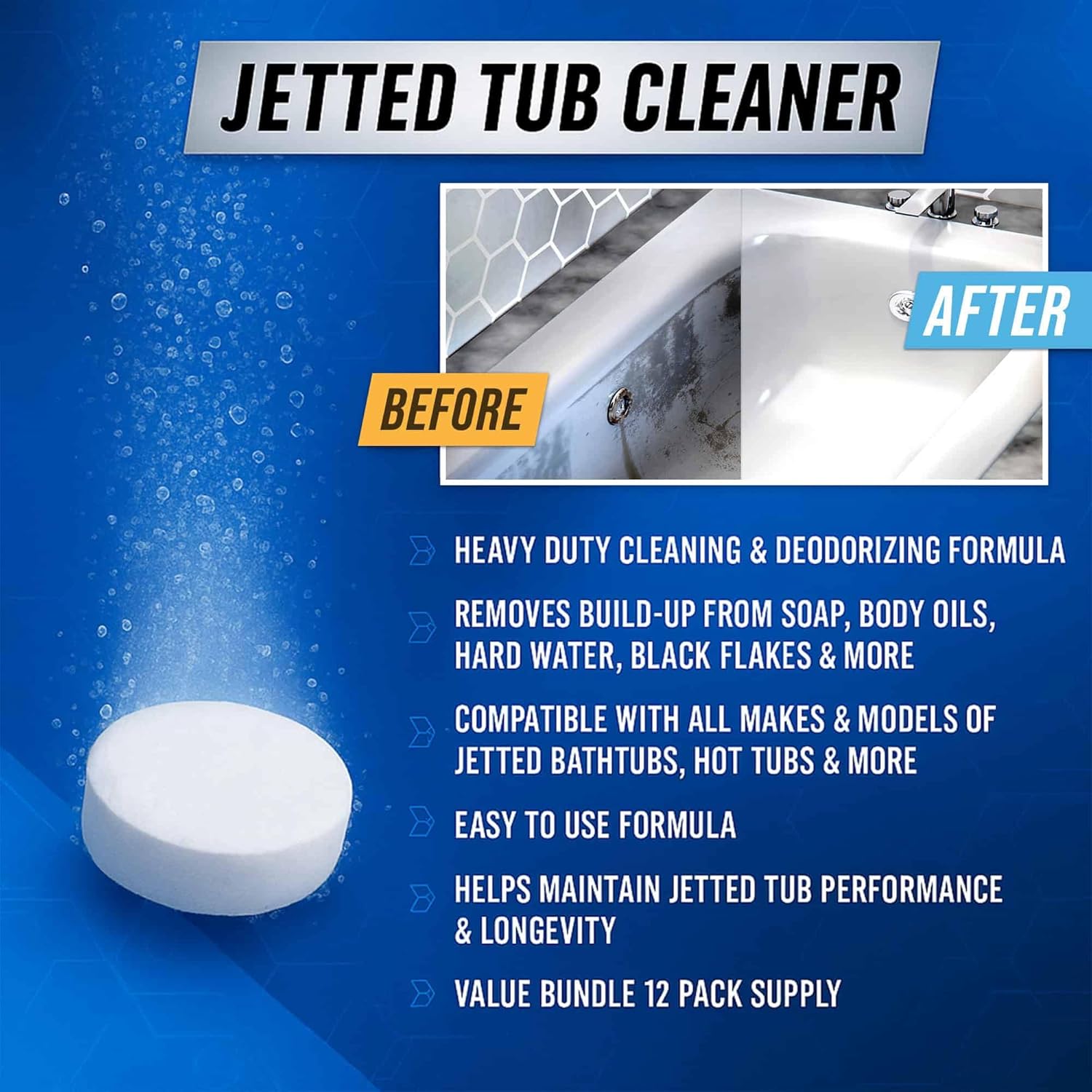 Jetted Tub Cleaner Bathtub Tabs - 12 ACTIVE Cleaning Tablets, Compatible with Whirlpool & Spa Bath System, Jets, Whirl Tubs, Professional Septic Safe Bath Jet Scale and Residue Remover - 1 Year Supply