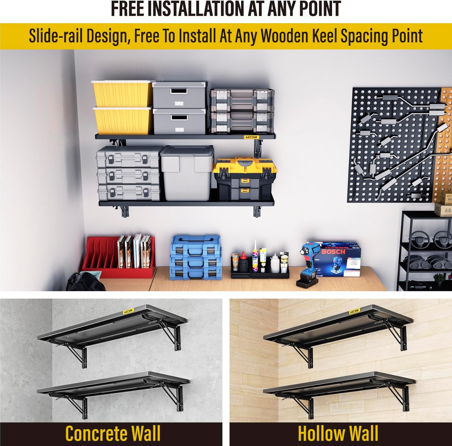 - KIT INCLUDES:Includes 2pcs of face plate; 4 Folding Brackets; 24 Hexagonal screws (Hardened ∅0.2" L/2"); 4 Sets of rail attachment bolts; 1 Drill bit; 1 Socket; 1 installation manual. All hardware of AECXM Professional Series Wall Mounted Shelf are under strict quality control and testing, We strive to provide our customers with a quality shopping experience, If you have any questions, Please feel free to contact us