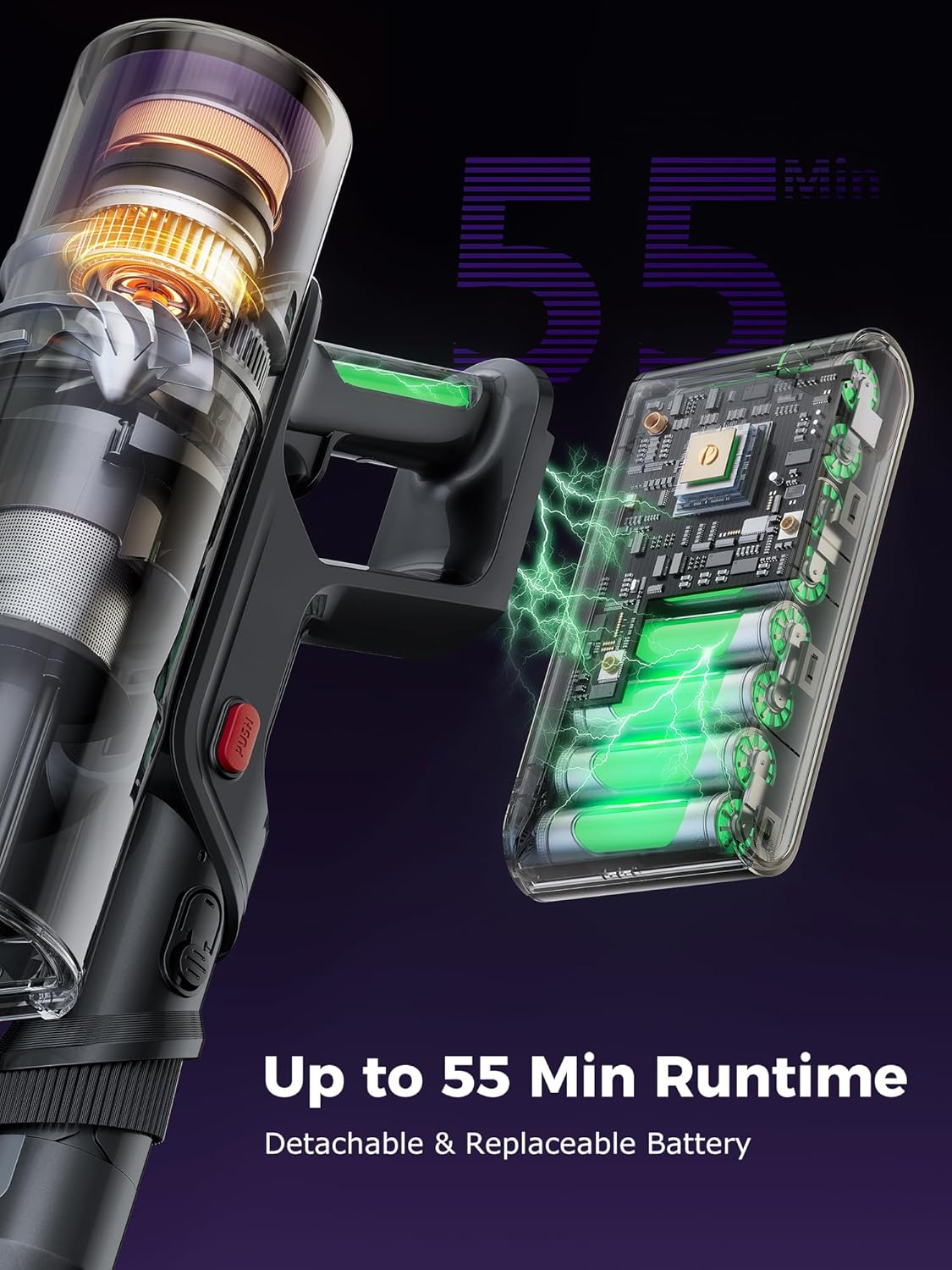 - 【55-Mins Runtime with Real-Time Countdown】The P16 cordless vacuum cleaner comes with detachable 2,200 mAh *8 battery packs, providing up to 55 minutes of runtime on a single charge! Monitor remaining time for each mode on the digital LED screen—no more battery anxiety