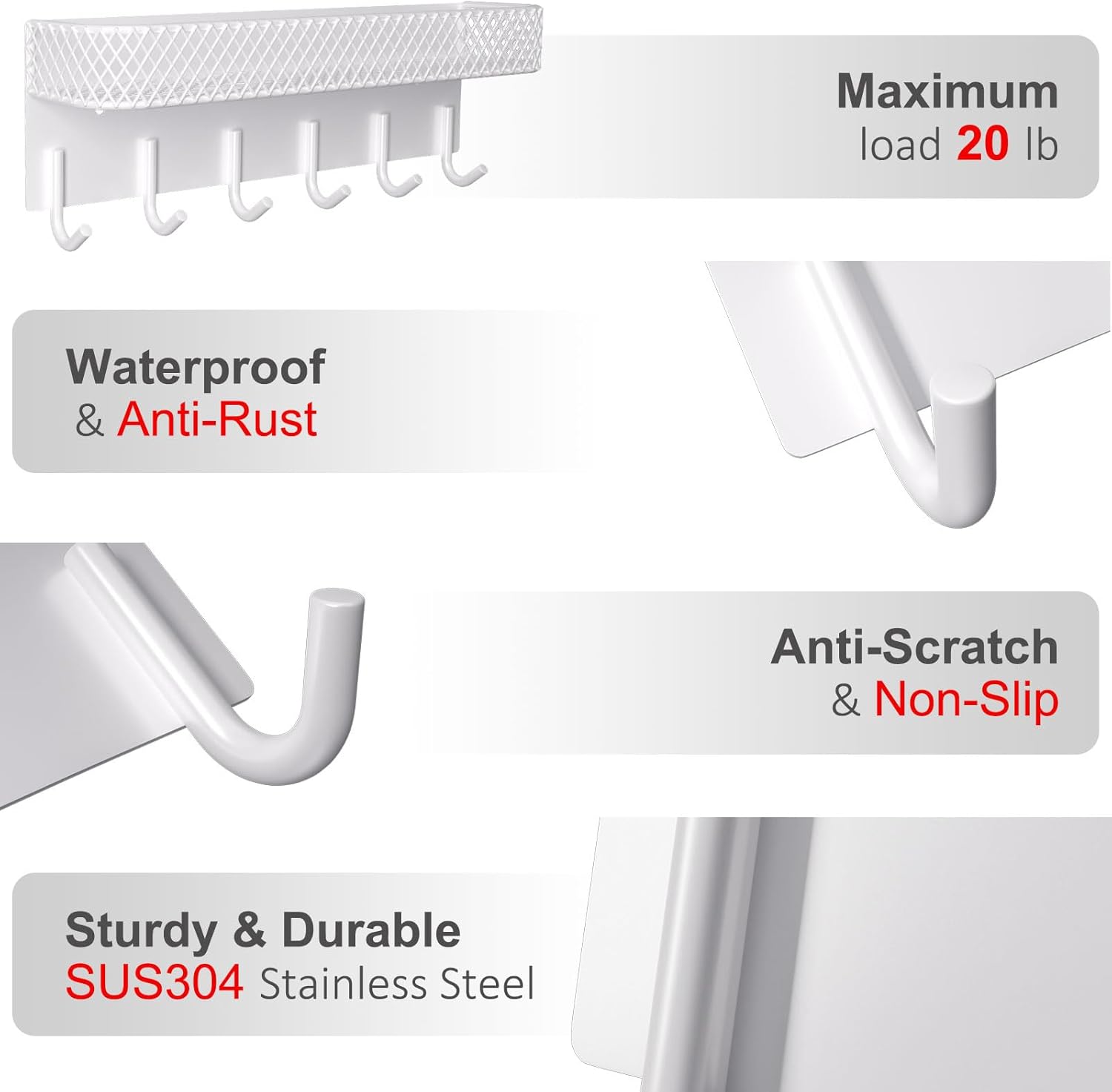 Key Holder for Wall – Decorative Stainless Steel Key Hanger with 6 Hooks for Hats, Bags, Leashes – Mail Holder Key Rack with Mounting Hardware and Guide (9.65” x 2.8” x 2.2”) (White)