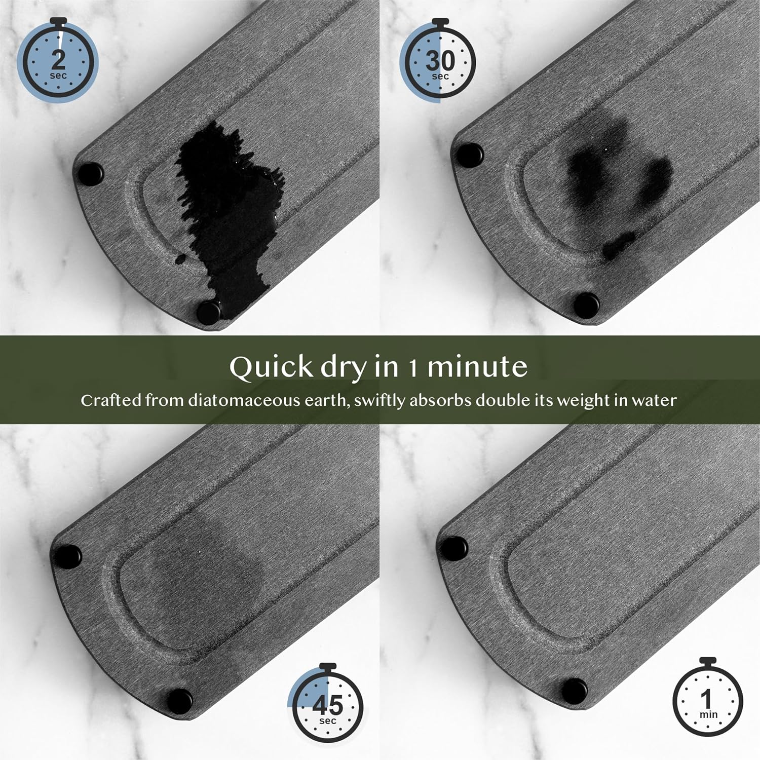 - Raised Stainless-Steel Feet with Air Ventilation – Sturdy 1.4-inch stainless steel legs lift the absorbent stone tray above the surface, improving airflow underneath and accelerating evaporation. This elevated non-slip design helps keep your countertop cleaner and extends the life of your drying rack compared with low-cost flat trays