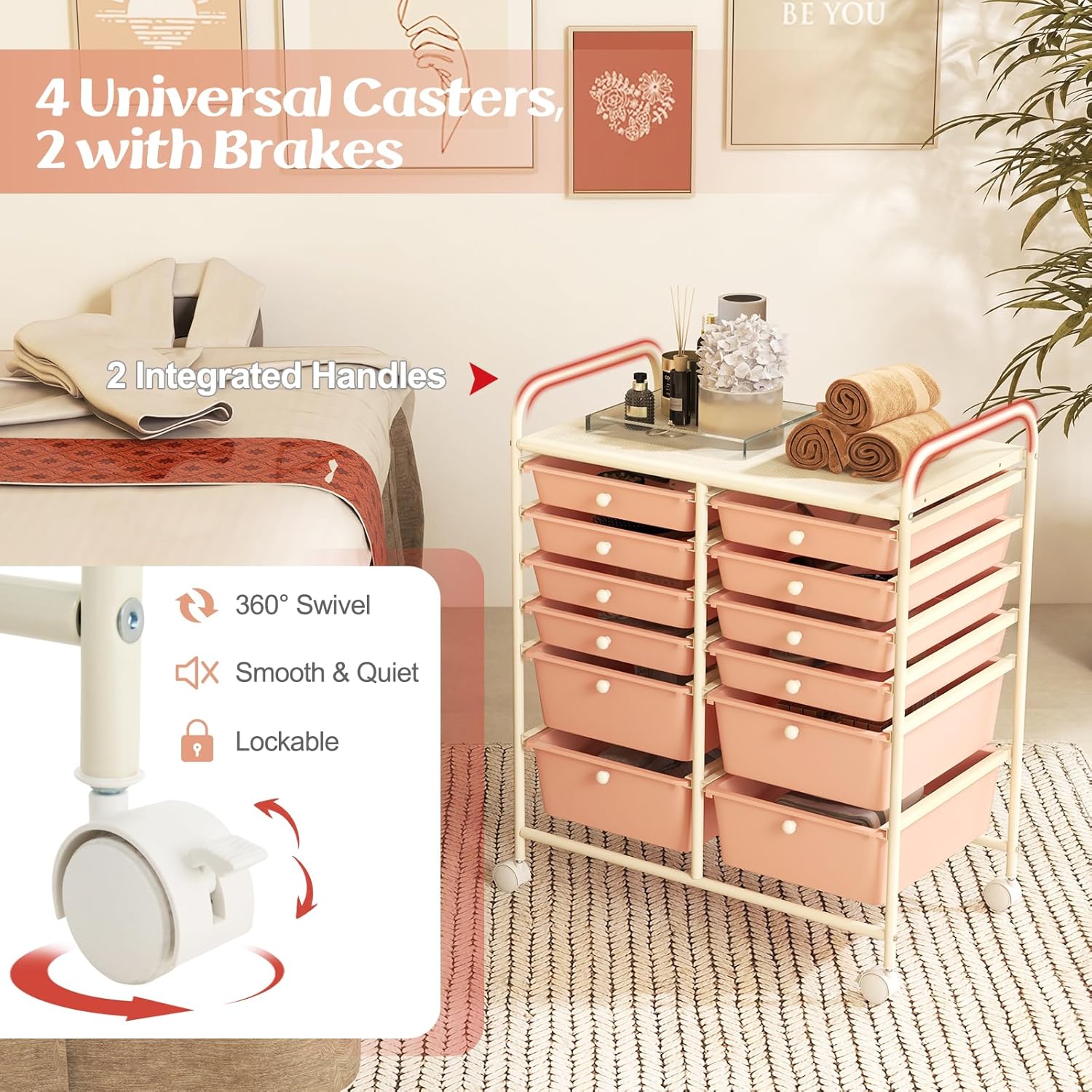 GOFLAME 12-Drawer Rolling Storage Cart, Multipurpose Organizer Cart with 2 Sizes Plastic Drawers, Mobile Utility Cart with Lockable Casters for School, Home Office, Beauty Salon, Peach Fuzz