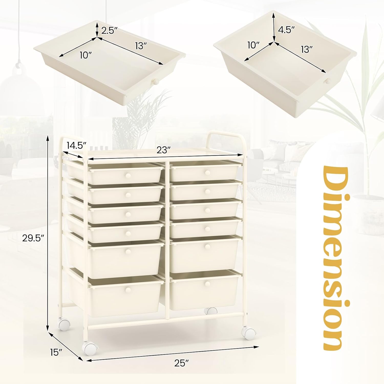 - 12 Drawers with Enough Space: Comes with 12 drawers, the rolling cart will provide ample space for you to store stuff in different categories. The 4 drawers are big and the other 8 are small. It is easy to find the thing you need if you keep them in order. With smooth slide, the drawers are easy to open or close.