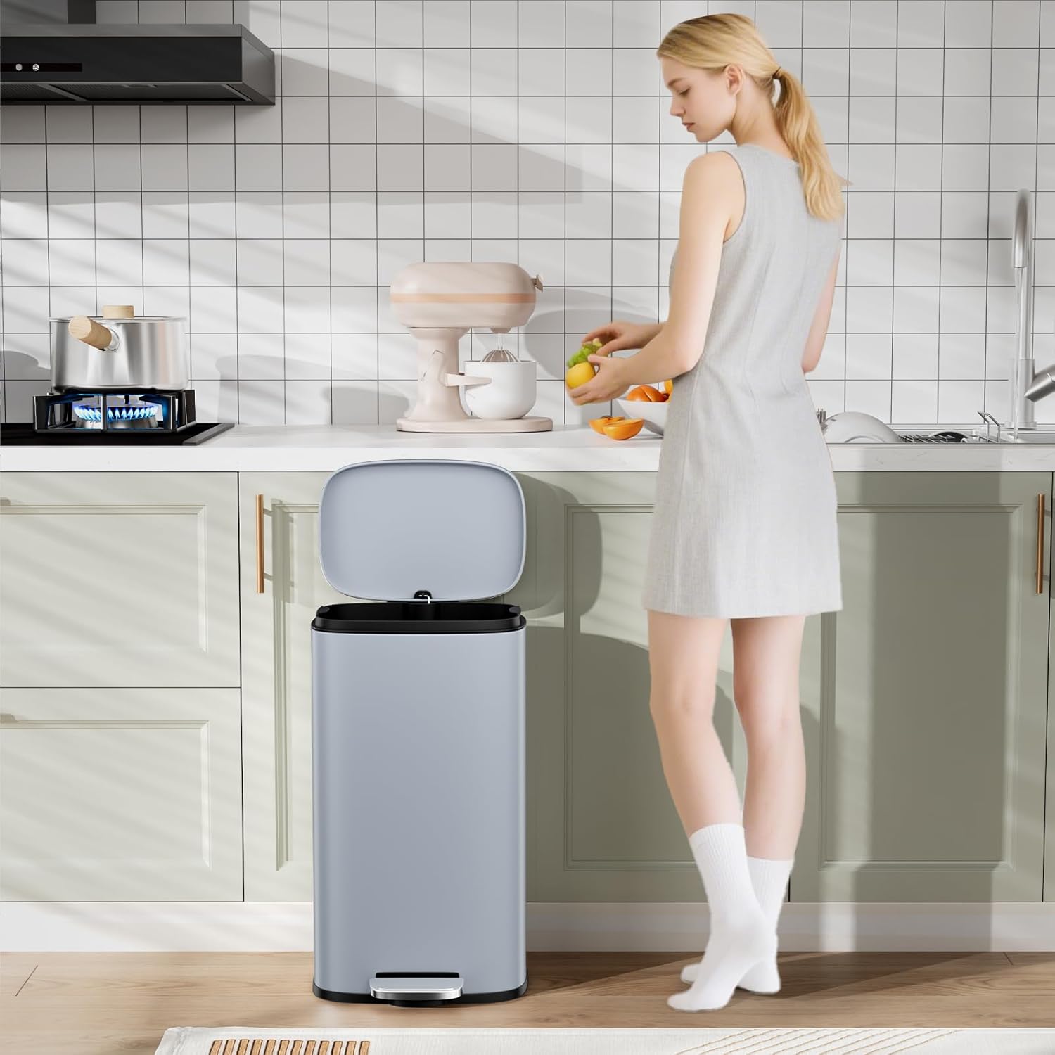 Arlopu 8/13.2 Gallon Step Trash Can, Stainless Steel Garbage Bin, Soft-Close Rubbish Bin with Removable Plastic Inner Bucket, Fingerprint-Proof, Lid Dustbin, Suit for Kitchen Home (Haze Blue, 50L)