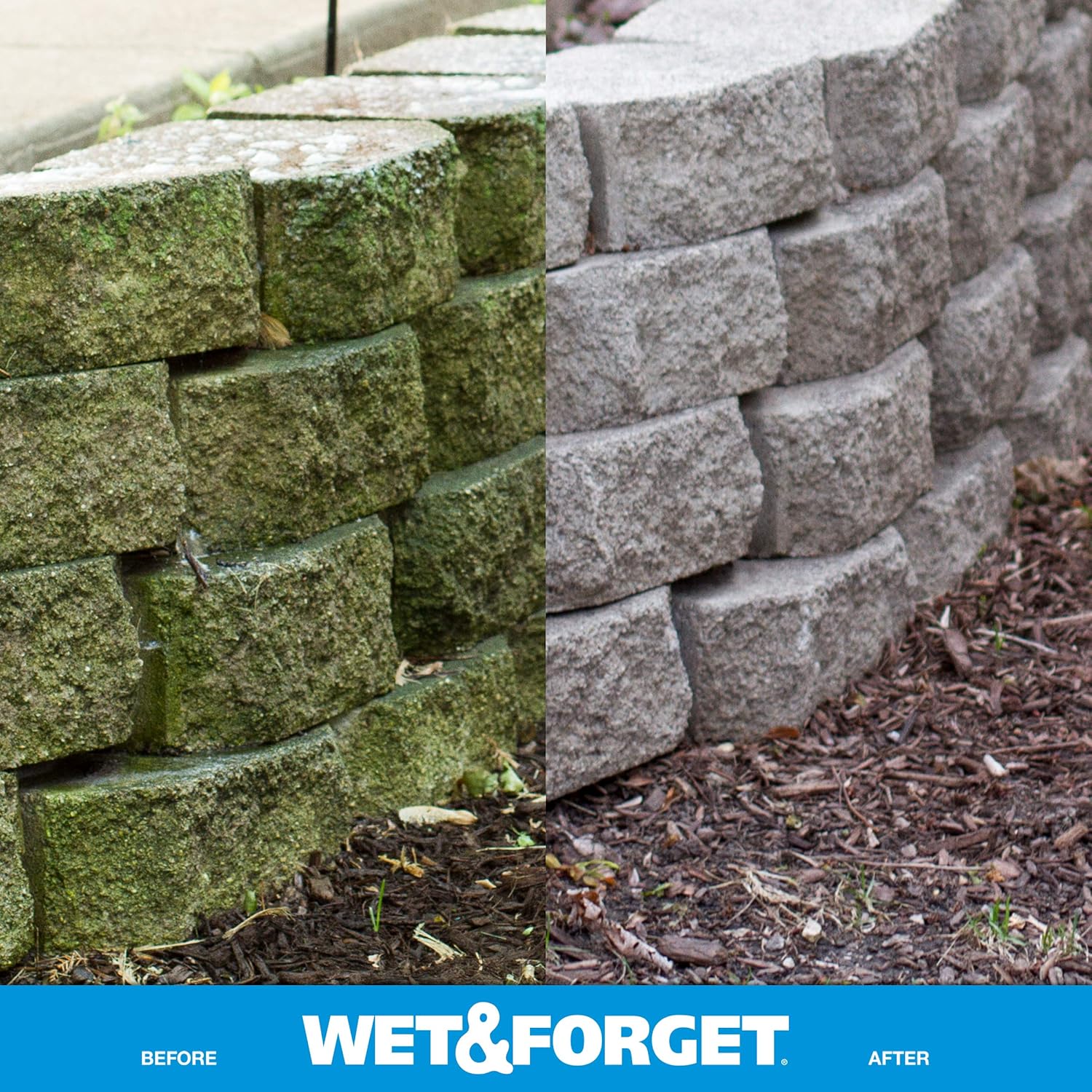 - Wet & Forget Concentrate Outdoor Cleaner removes green and black stains caused by moss, mold, mildew, and algae, no scrubbing, no rinsing, no pressure washing, just wet it and forget