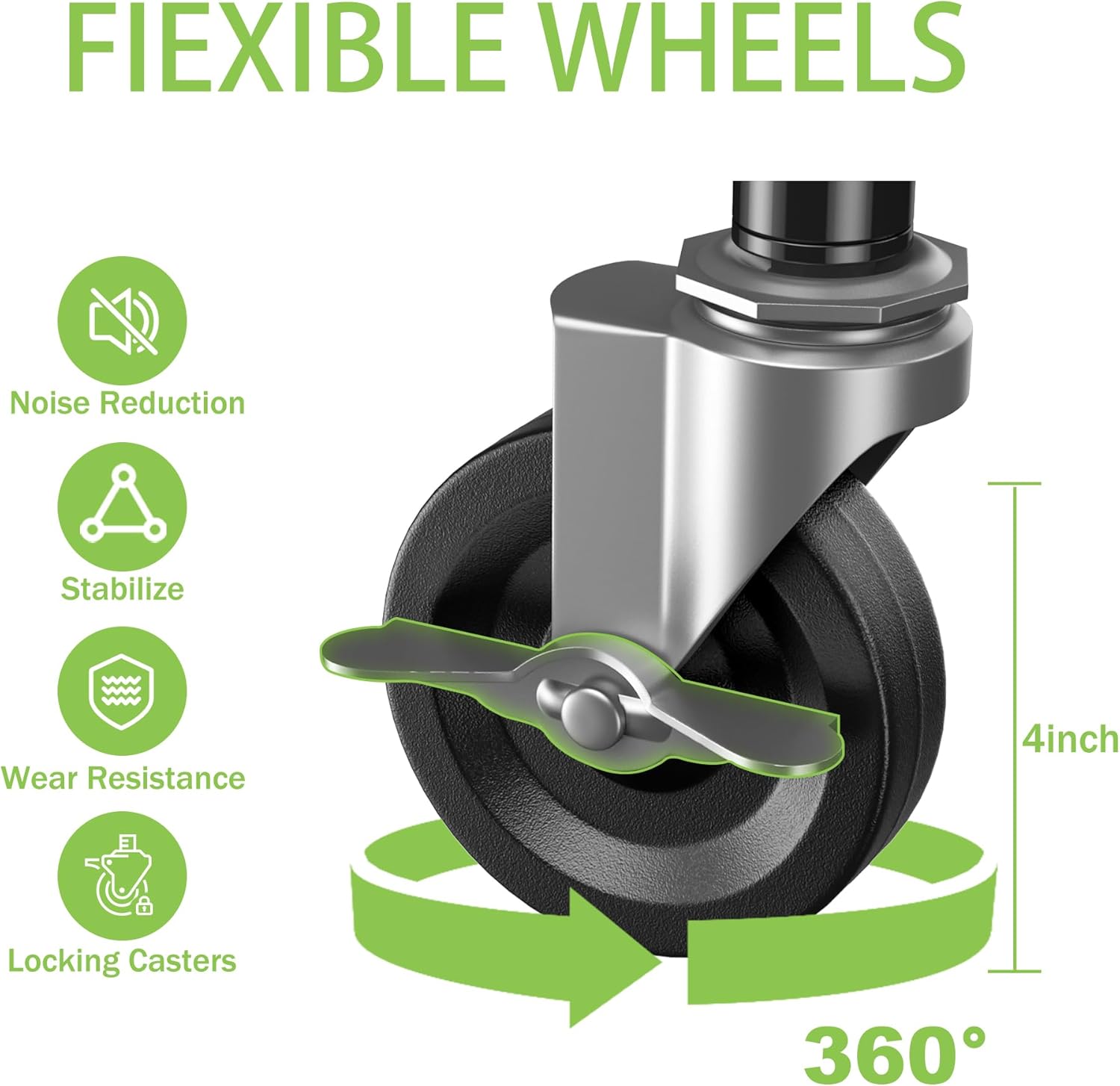 - 【360° Casters & Fixed Locks】Steel Wire Cart is equipped with 4-inch industrial-grade silent universal casters, which is convenient for easy and smooth movement on different terrains, including two wheels with fixed locks, which can be fixed or moved at any time to ensure stability and safety during use
