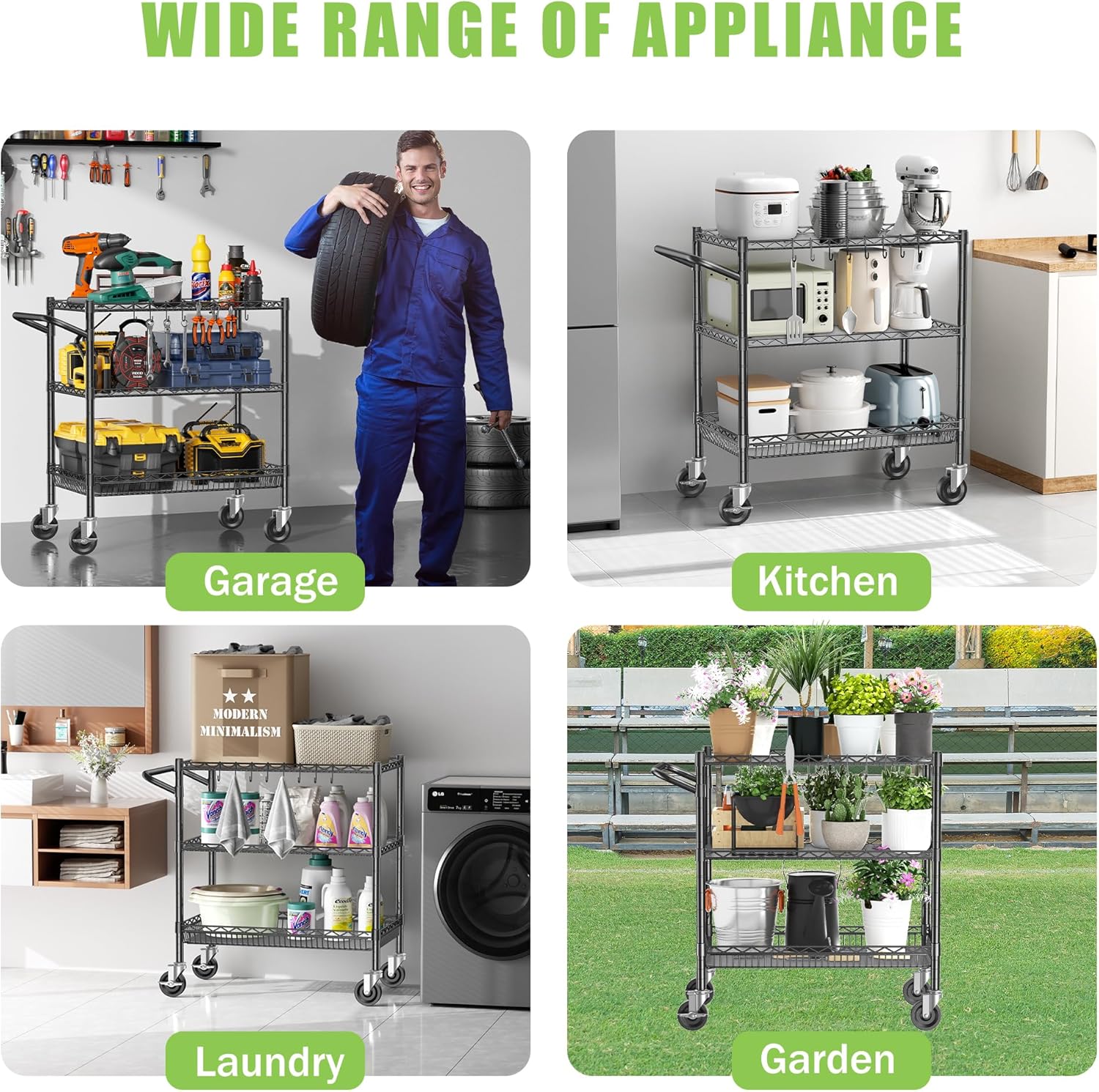 3 Tier Metal Cart with Wheels, Heavy Duty Utility Rolling Cart 1050lbs, Commercial Grade Kitchen Trolley with Handle Bar&Shelf Liner, Mobile Steel Wire Trolley for Warehouse Garage Kitchen