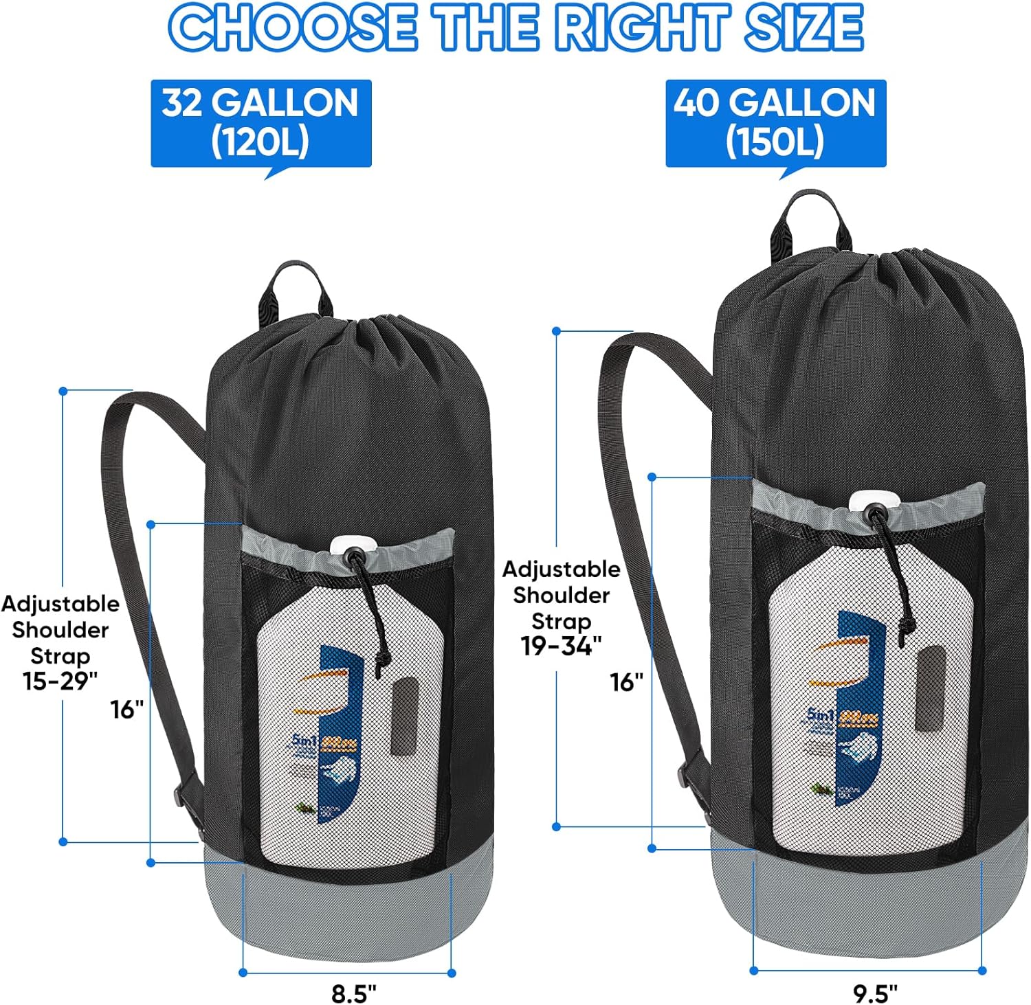 - 120L Large Laundry Bag: These travel laundry bags measure 29 "H X 13 "L with a large capacity of up to 120 L, enough for holding 2-3 batches of clothes; They also feature two front mesh wash pockets (16 "H X 8.5"L each), making your laundry backpack have space for storing detergent, shoes, and other essentials