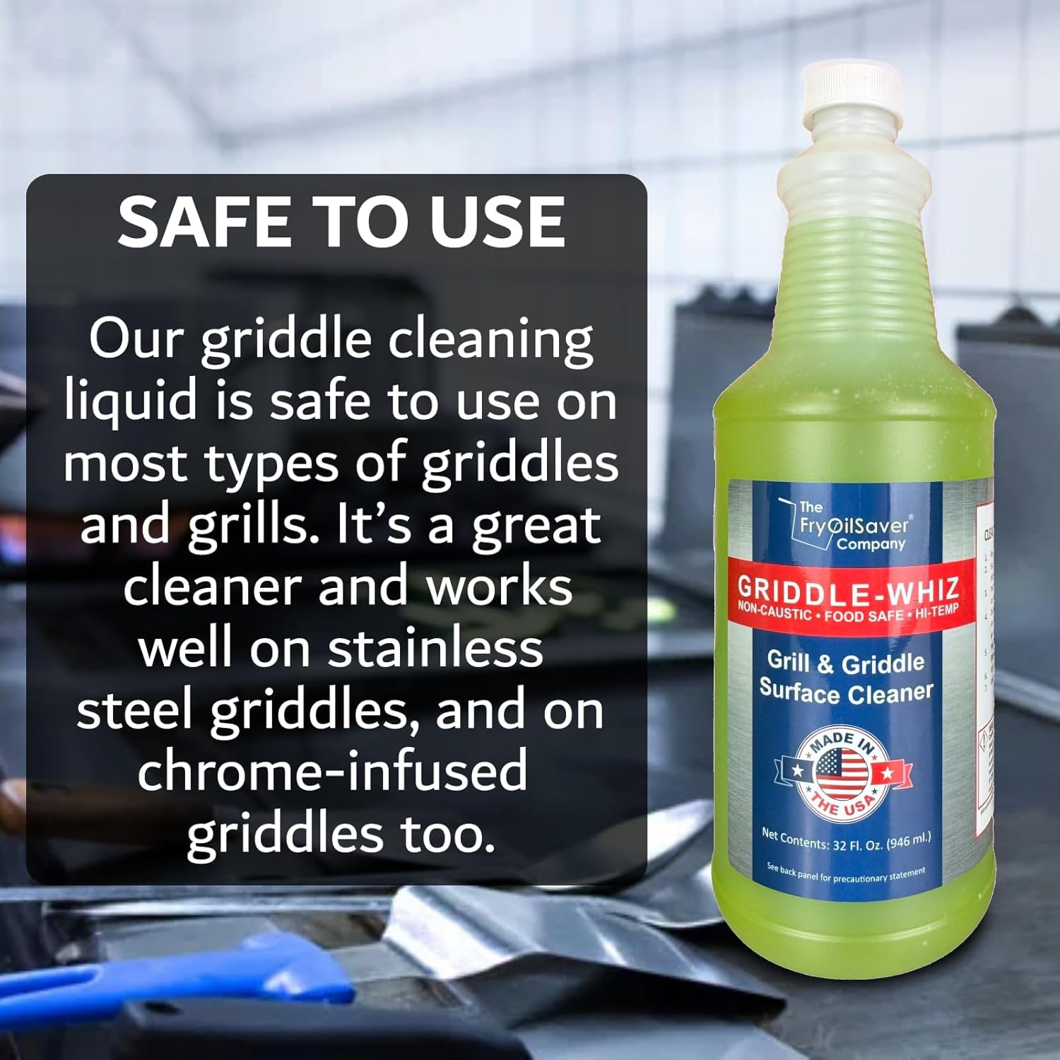 - POWERFUL & FOOD-SAFE, NON-TOXIC FLAT TOP GRILL & GRIDDLE CLEANER FOR DAILY USE - Griddle-Whiz Grill and Griddle Surface Cleaner is non-toxic, food-grade, and specially designed for safe use on food-contact surfaces—leaving no harmful residues that could affect the flavor or safety of your meals. Ideal for daily cleaning in restaurants, commercial kitchens, and food trucks, this heavy-duty formula delivers maximum results with minimal effort. For best performance, apply approximately 2 fluid ounces to a heated flat top grill surface at around 325°F, let it sit for 30 seconds, and watch as tough grease, carbon, and food residue.