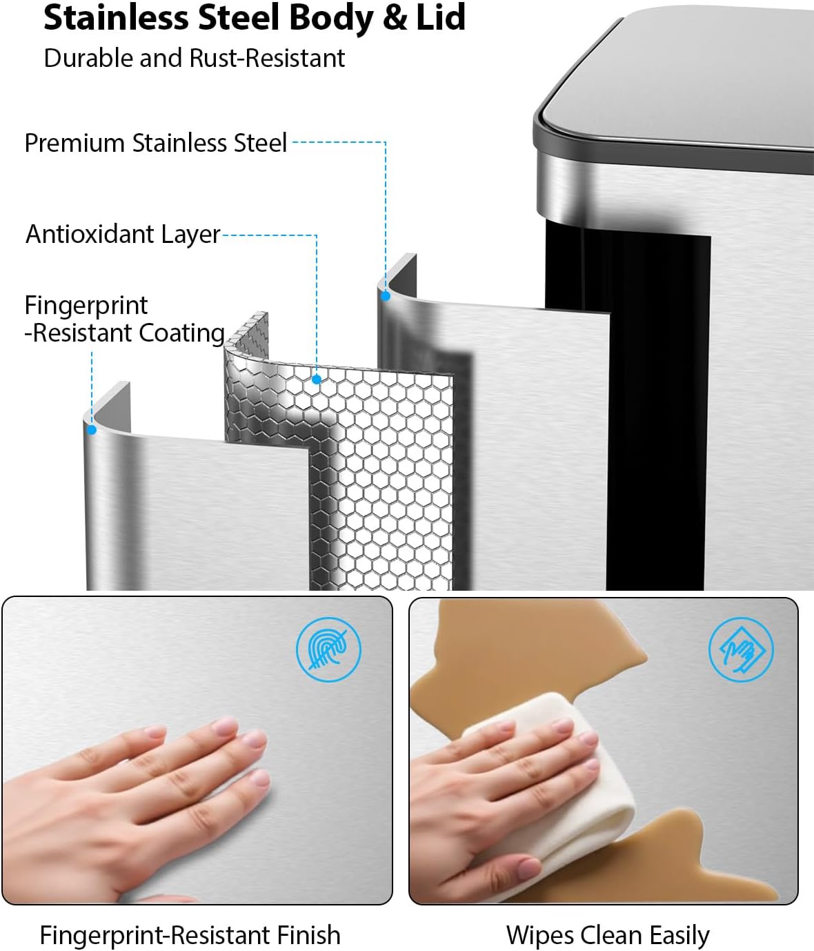 - Hands-Free Operation: Our kitchen garbage can features durable stainless steel pedals for hands-free trash disposal. The stainless steel foot pedal has a service life of over 200,000 times, that's more than 20 steps a day for 30 years