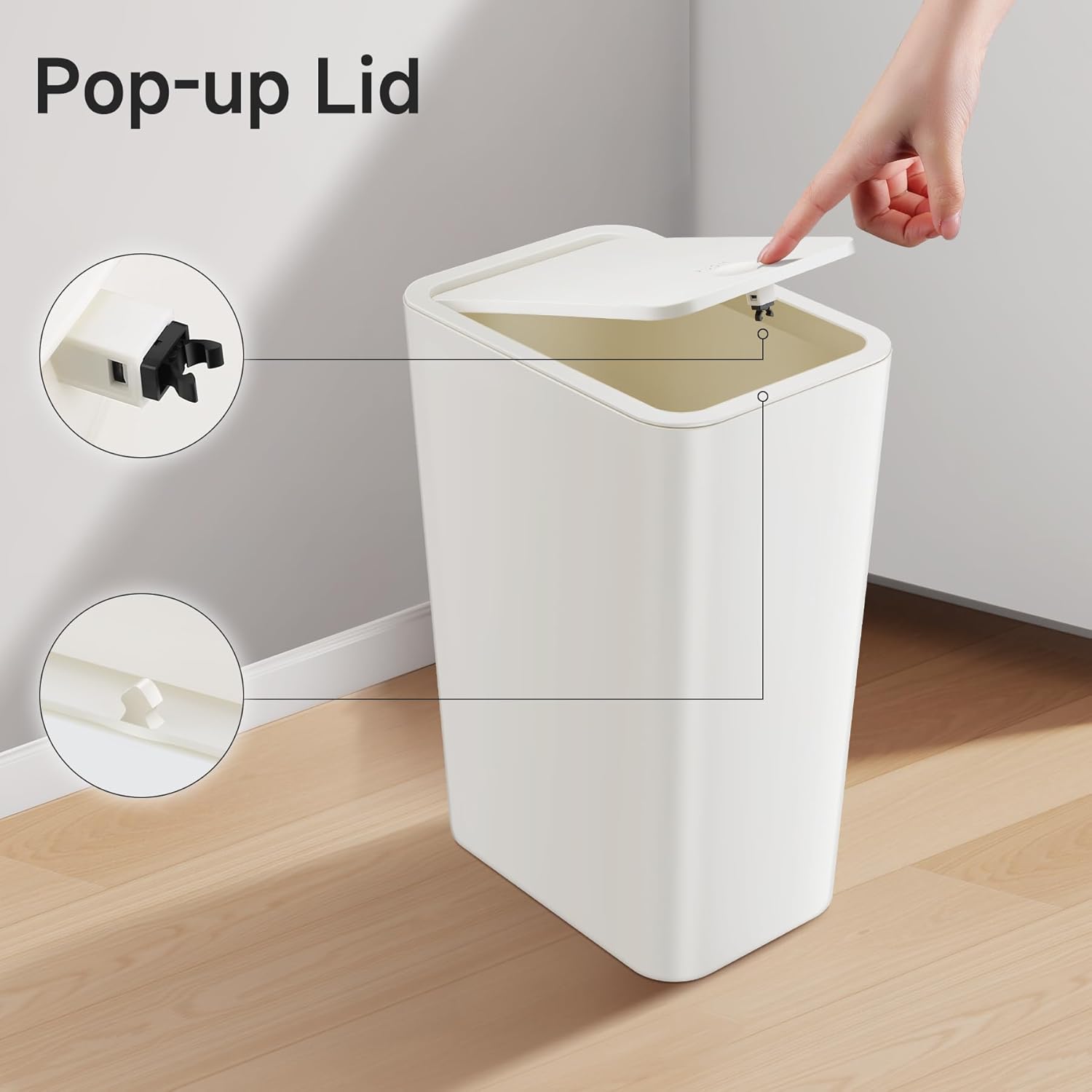 TIPGO Bathroom Trash Can with Lid, 4 Gallon / 15 Liter Small Garbage Can, Press Top Bin, Plastic Wastebasket with Pop-Up Lid for Bedroom, Living Room, Office (White, 2 Pack)