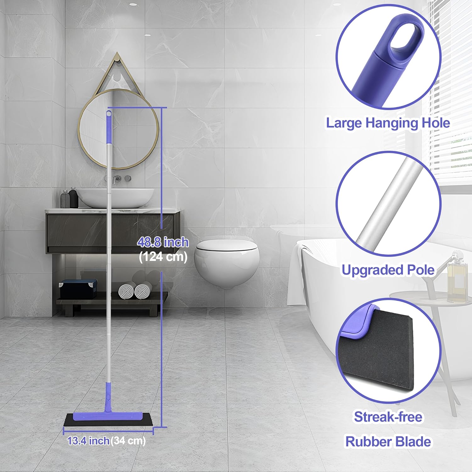 - 【EASY TO CLEAN & STORE】The squeegee broom features a hanging hole for convenient storage. After use, simply rinse it under the faucet and hang it on the wall to save space.