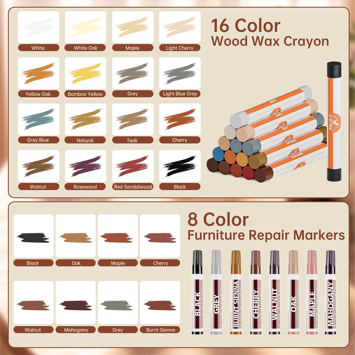 A-HEYIDA Wood Filler Sticks -16 Colors Wax Crayons for Furniture Scratch & 8 Colors Wood Touch-up Markers for Repair Any Scratches, Scuffs, Cracks and Nail Holes on Furniture,Floors,Doors,Cabinets