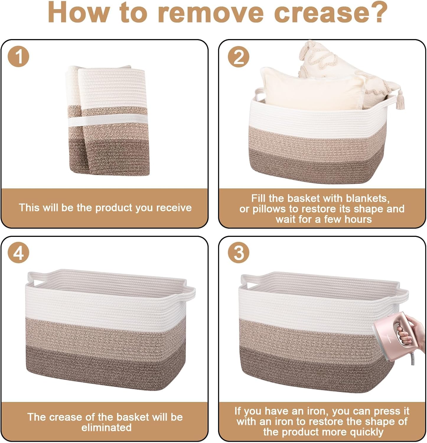 - NOTE: The toy basket is folded, but it will turn back to its elegant shape quickly if you fill it with some pillows or blankets, and iron is great idea to remove the creases