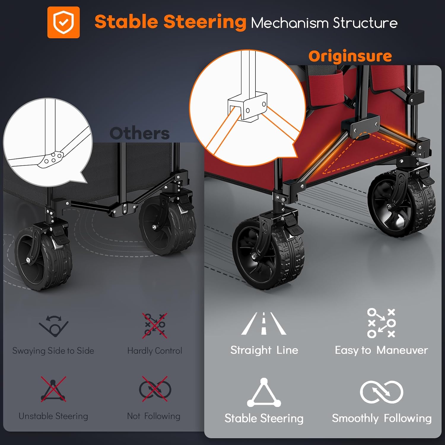 - ใ๐ฃ๐ฎ๐๐ฒ๐ป๐๐ฒ๐ฑ ๐ฆ๐๐ฎ๐ฏ๐น๐ฒ ๐ฆ๐๐ฒ๐ฒ๐ฟ๐ถ๐ป๐ด ๐ ๐ฒ๐ฐ๐ต๐ฎ๐ป๐ถ๐๐บ & ๐๐ฑ๐ท๐๐๐๐ฎ๐ฏ๐น๐ฒ ๐ฅ๐ฒ๐ฏ๐ผ๐๐ป๐ฑ๐ฎ๐ฏ๐น๐ฒ ๐๐ฎ๐ป๐ฑ๐น๐ฒ ๐๐ผ๐น๐ฑ๐ถ๐ป๐ด ๐ช๐ฎ๐ด๐ผ๐ป ๐๐ฎ๐ฟ๐ใThis foldable cart features an stable innovative steering mechanism structure, Restoring the swaying 3-point handle-frame connection, resolving the problems of swaying side to side, loss of control, and steering difficulties of similar carts, significantly enhanced stability and maneuverability. A rebound adjustable handle with the lock can be freely adjusted in length, suitable for all types of people.