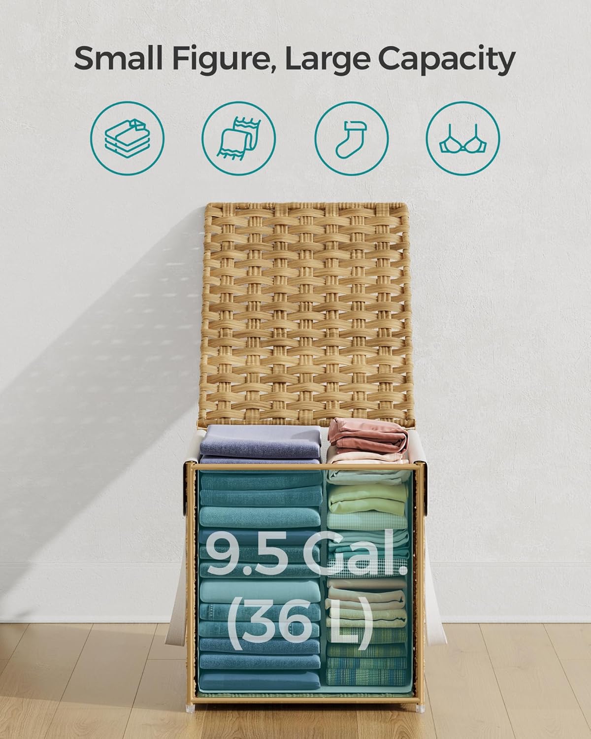 - [Perfect Size for Tight Spaces] This 15.7"L x 11.8"W x 12.2"H laundry basket offers 9.5 gallons (36 L) of laundry storage yet occupies a small footprint to fit in small spaces of your bathroom, bedroom, or laundry room