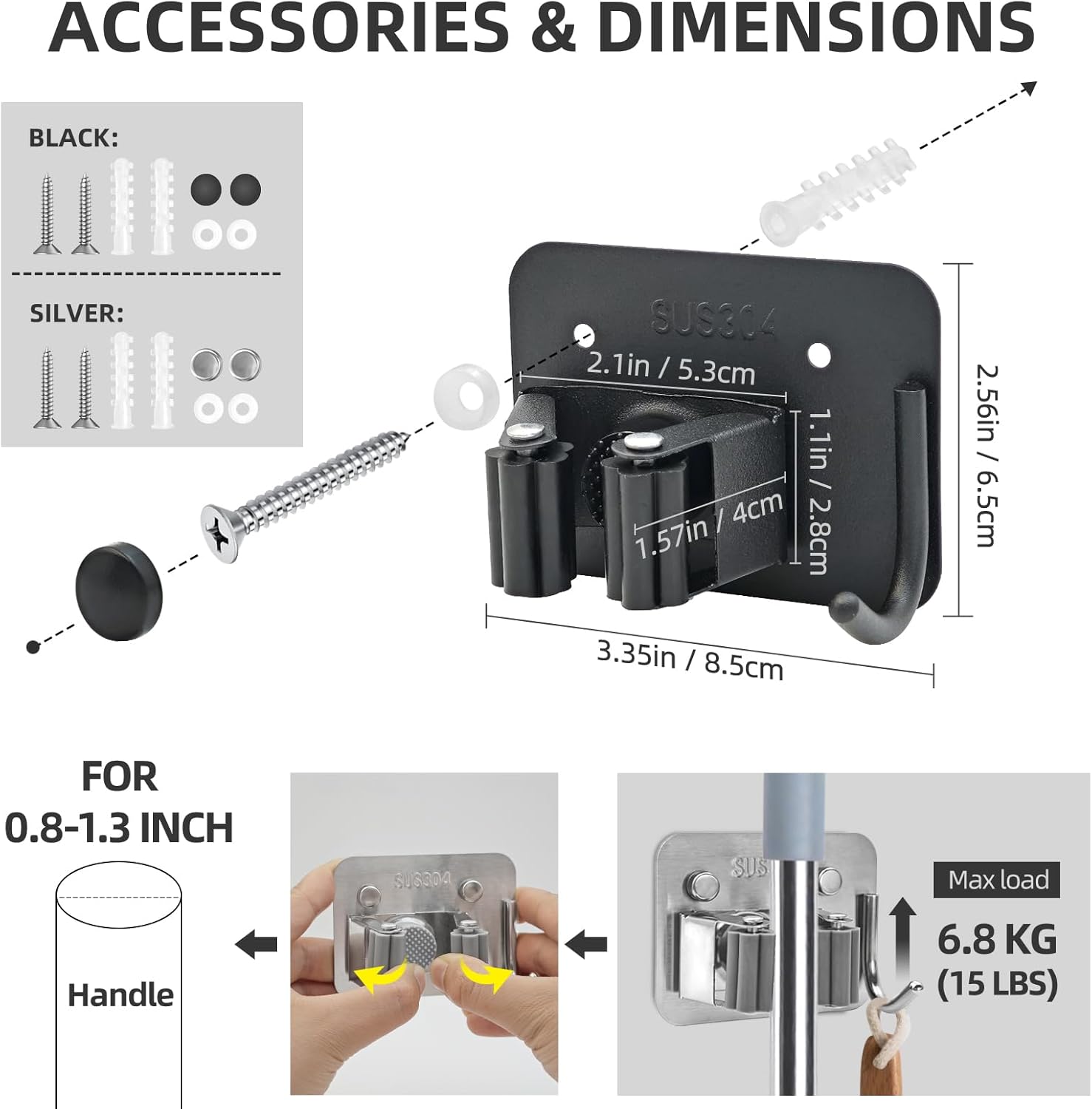 - đ§čăUtility & AestheticăCrafted from premium 304 stainless steel, this broom rack is durable and also rust-resistant. Our wall-mounted broom hooks can support an impressive weight of up to 15 pounds. In addition, each bracket is equipped with two screw decorative caps of the same color to ensure aesthetics. The sleek silver brushed and black frosted process designed to blend seamlessly into your space.