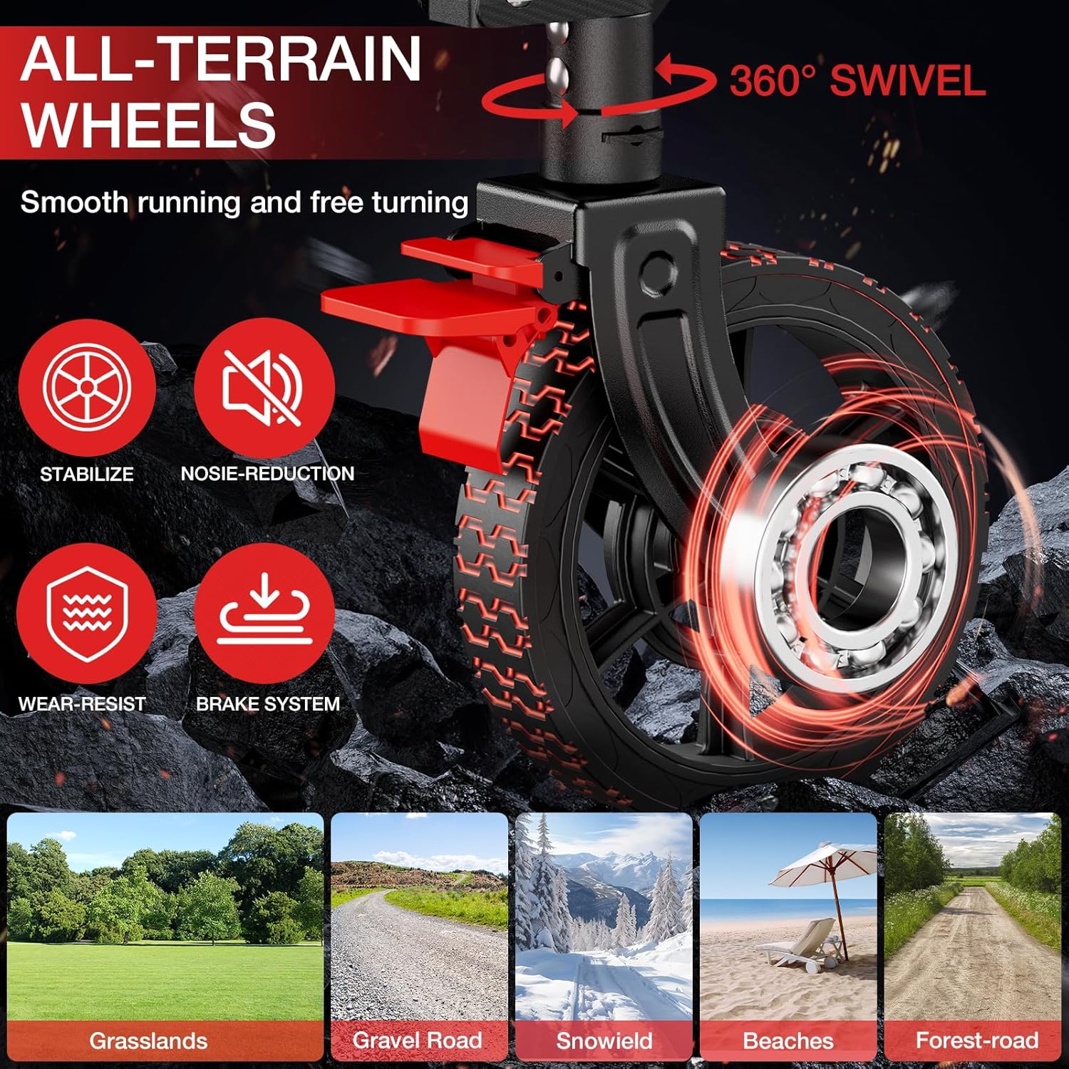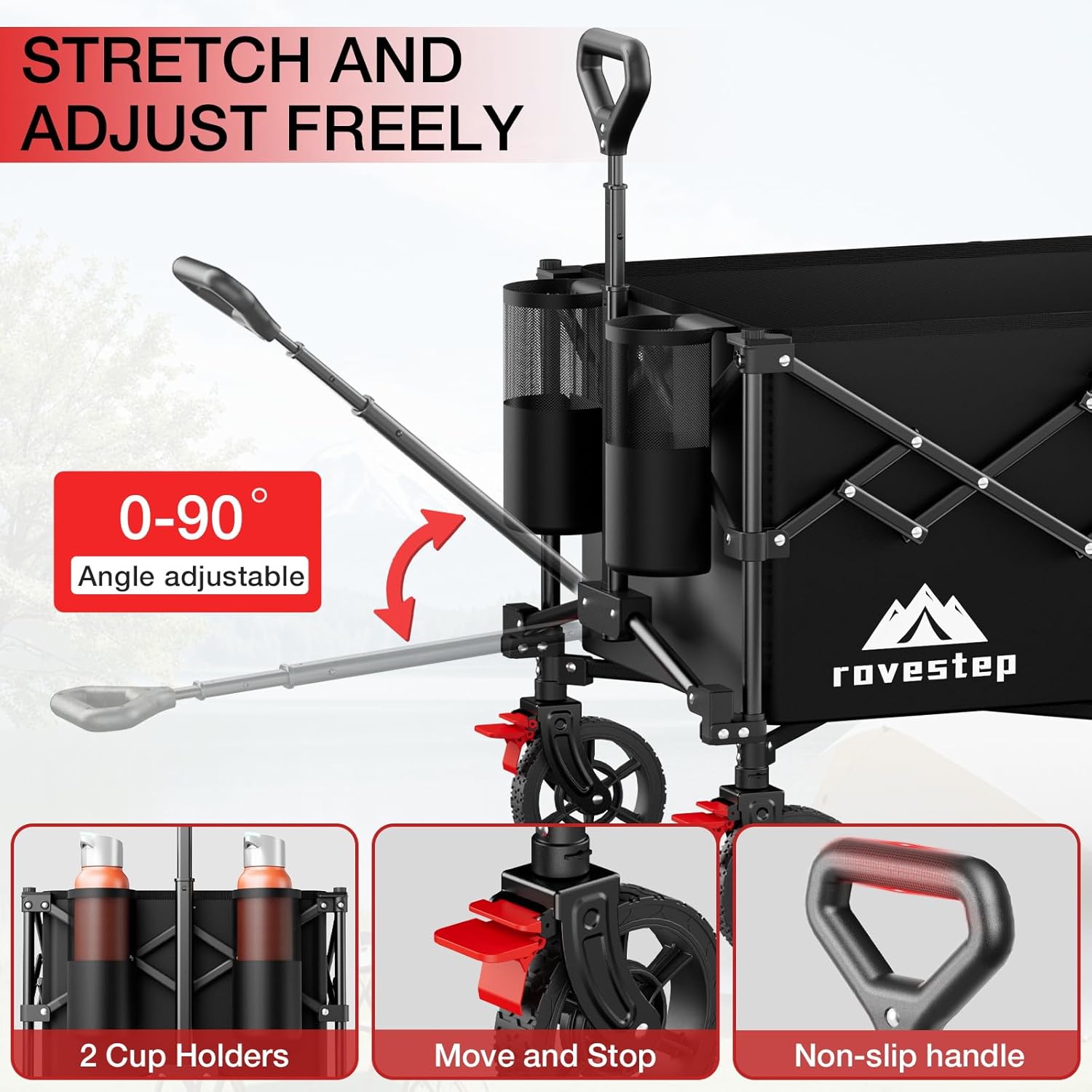 - All-Terrain Large Wheels:Equipped with large, all-terrain wheels, this collapsible wagon rolls smoothly over sand, gravel, dirt, and grass, providing effortless maneuverability for beach trips, camping, shopping, and outdoor adventures.