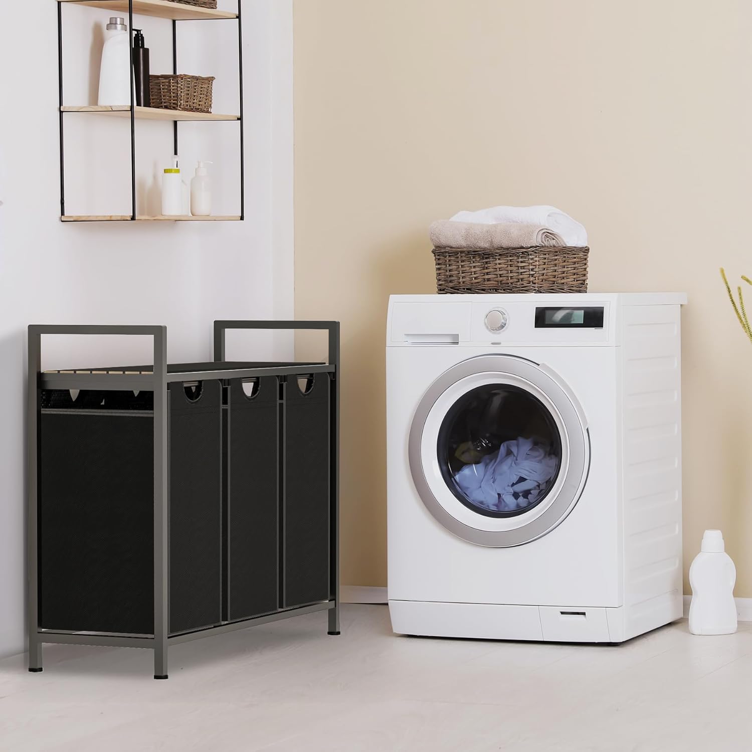 - Laundry Hamper with Shelf - The laundry basket is equipped with a top partition, provides extra space to organize used items, detergents, fabric softeners or toiletries, while its slatted design allows air to flow through for good ventilation, keeping your laundry odor-free. It can be used as decoration.