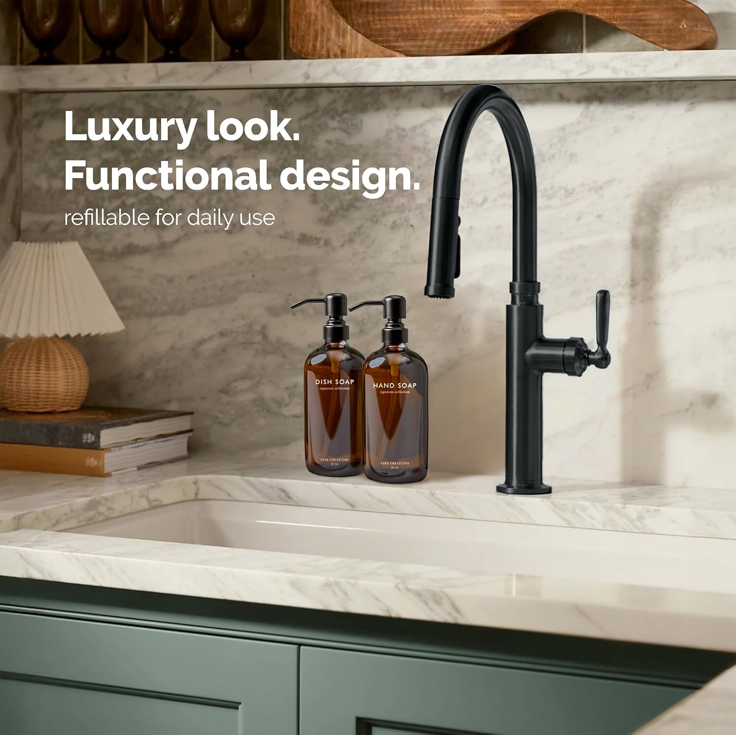 - BUILT TO PERFORM – Each dispenser is topped with a matte black stainless steel pump that’s as durable as it is refined. Rust-resistant, smooth to use, and designed to complement any modern kitchen or bathroom.