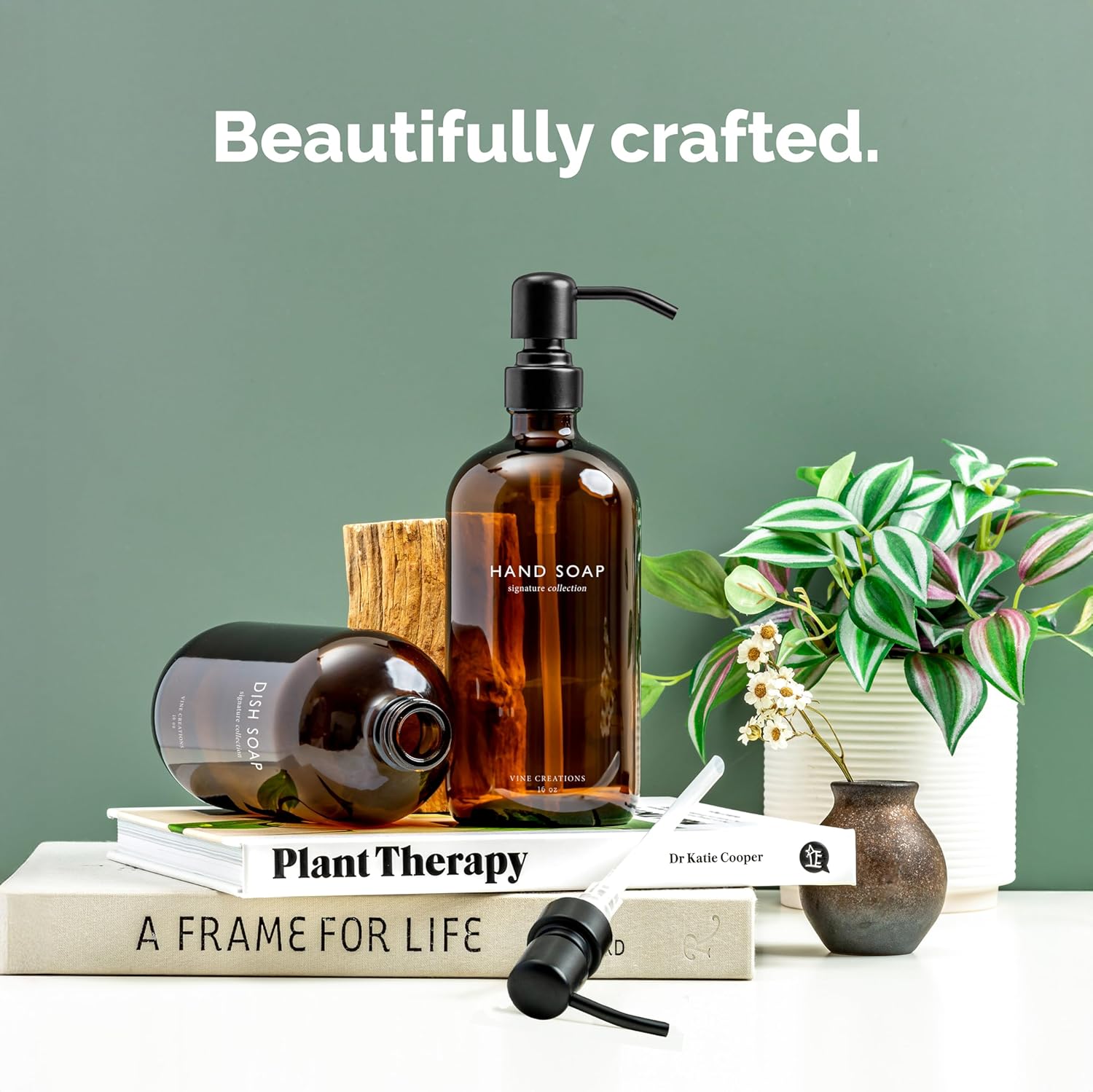 Vine Creations Amber Glass Soap Dispenser Set, Dish Soap and Hand Soap Dispenser Set with Stainless Steel Pump, 16 oz Glass Dispensers for Kitchen or Bathroom Decor (Amber Bottle/Matte Black Pump)