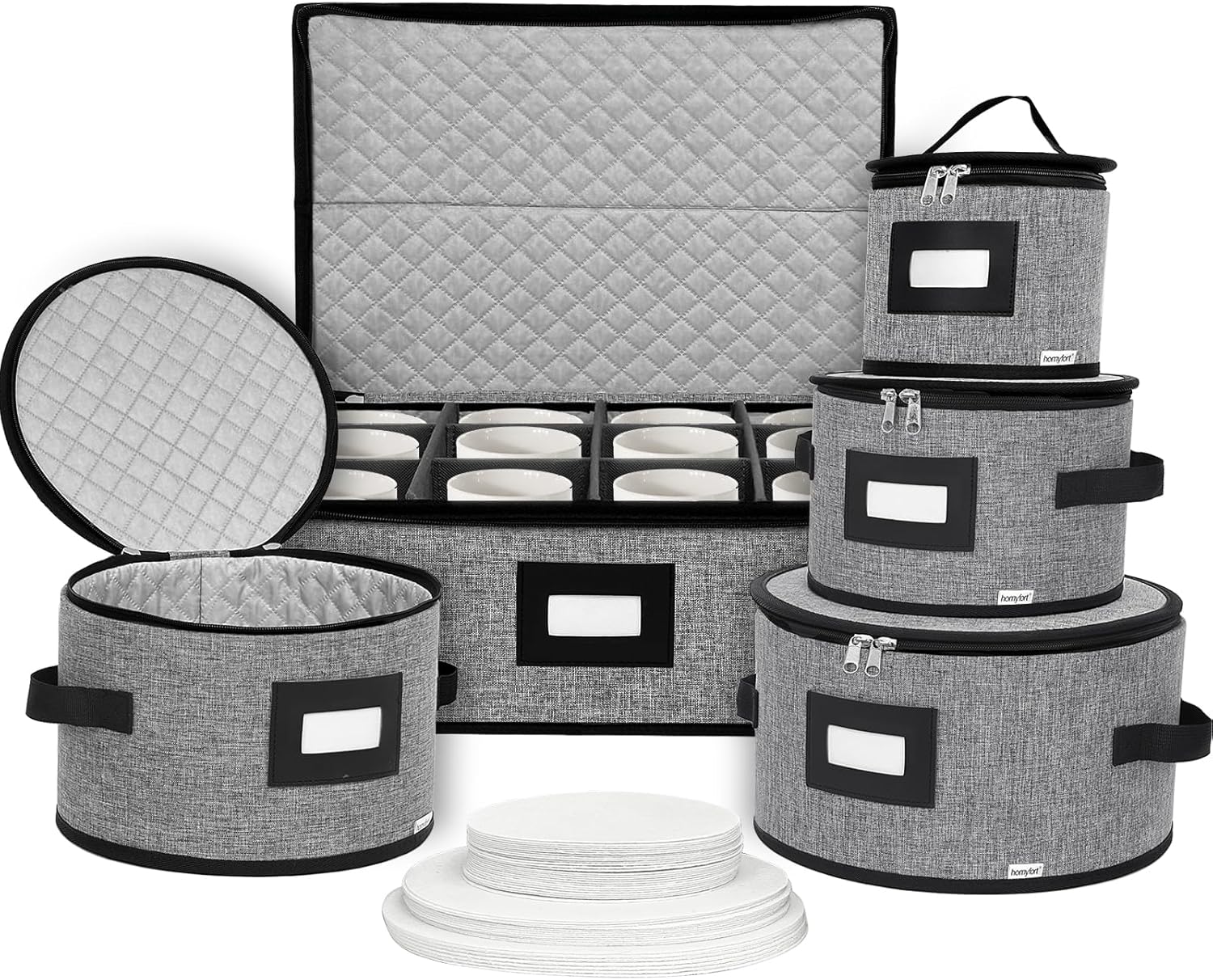 - 🥛5-Piece China Storage Set:This China organizer includes 4 plate cases (11" dinner, 10" salad, 9" dessert, 7" saucer) and 1 mug case (holds 12 cups). Includes 48 thick felt dividers for perfect spacing of all your tableware