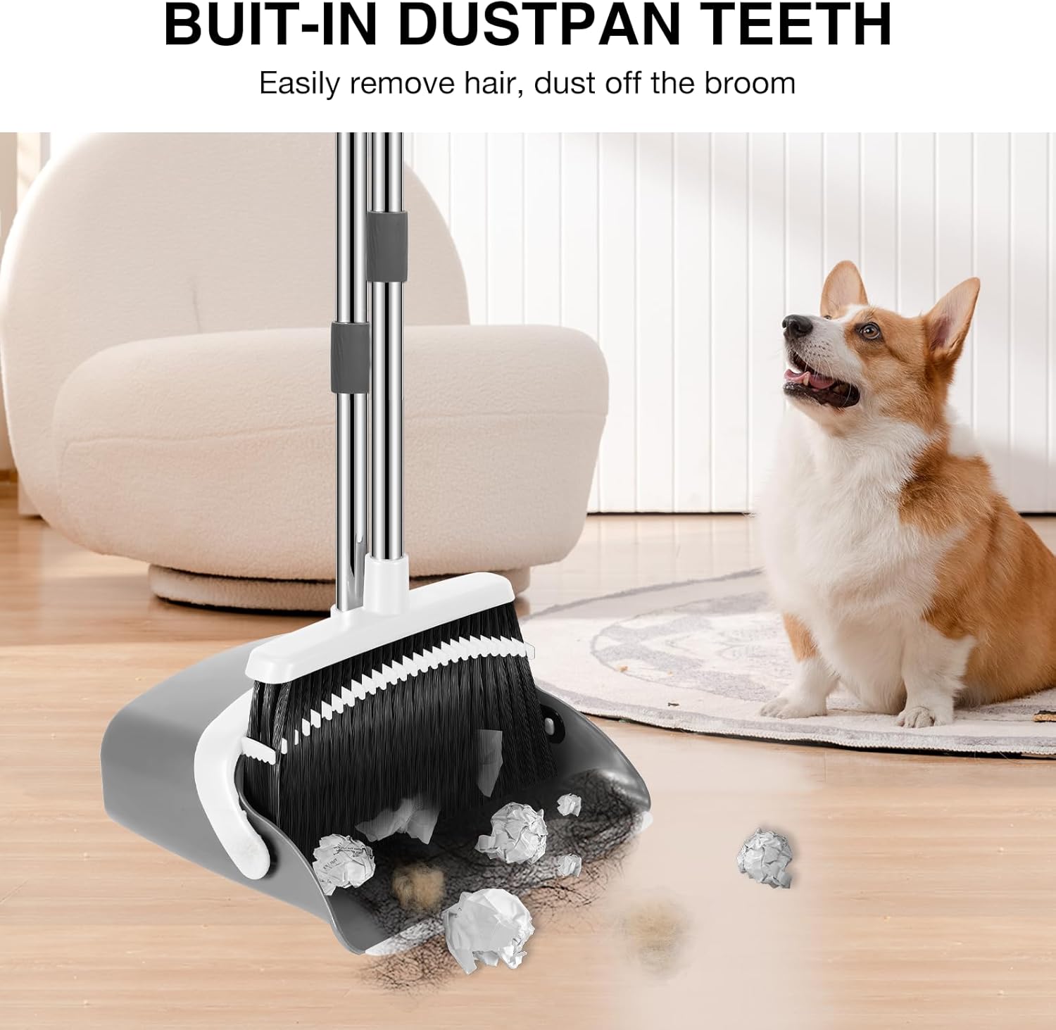 - BUILT-IN DUST PAN TEETH : The Household broom dustpan set has built-in comb teeth to easily scrape human/pet hair and trash from the broom into the dustpan without dragging by hand.
