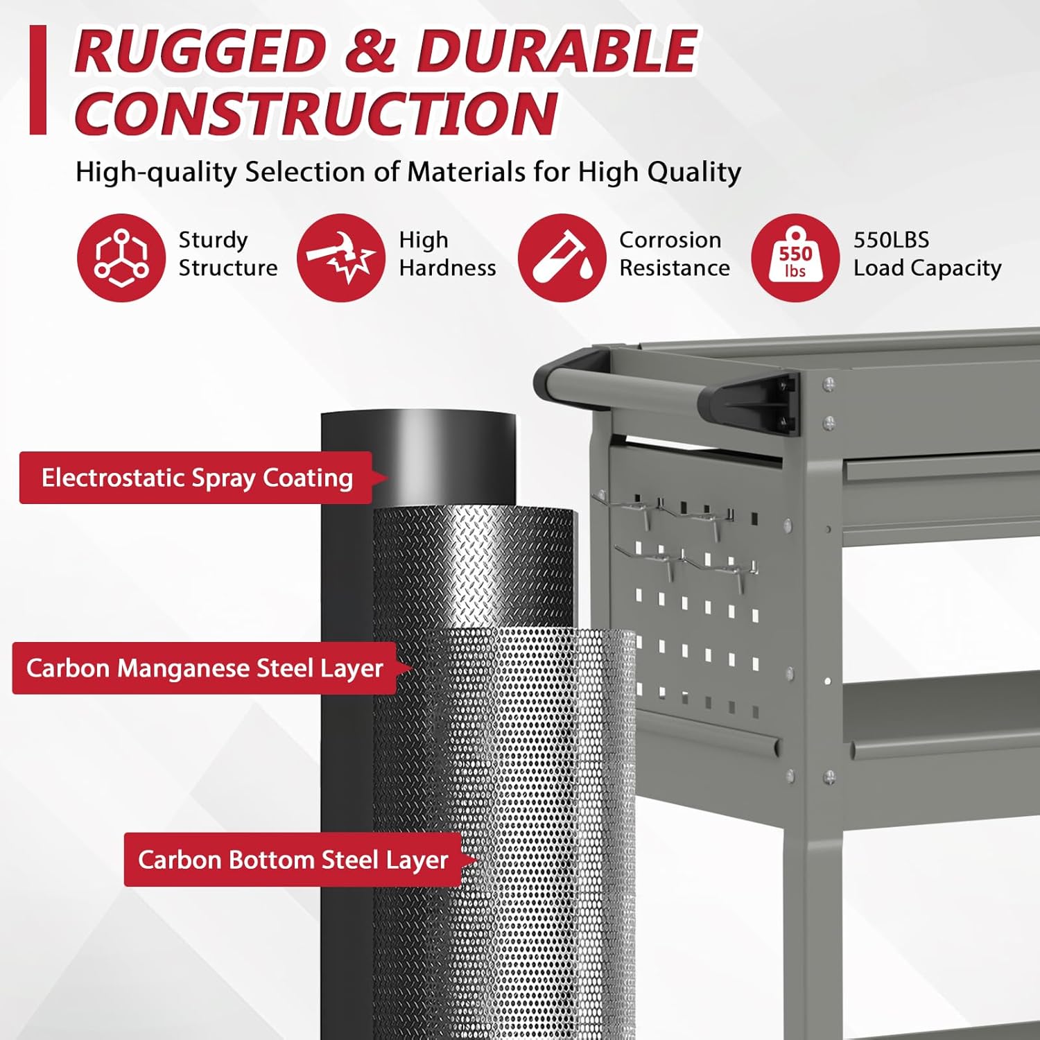 3 Tier Rolling Tool Cart on Wheels, Heavy Duty Industrial Utility Cart Service Cart with Drawer and Screwdriver Rack Pegboard, 550 LBS Mobile Tool Storage Organizer for Workshop, Garage(Gray)