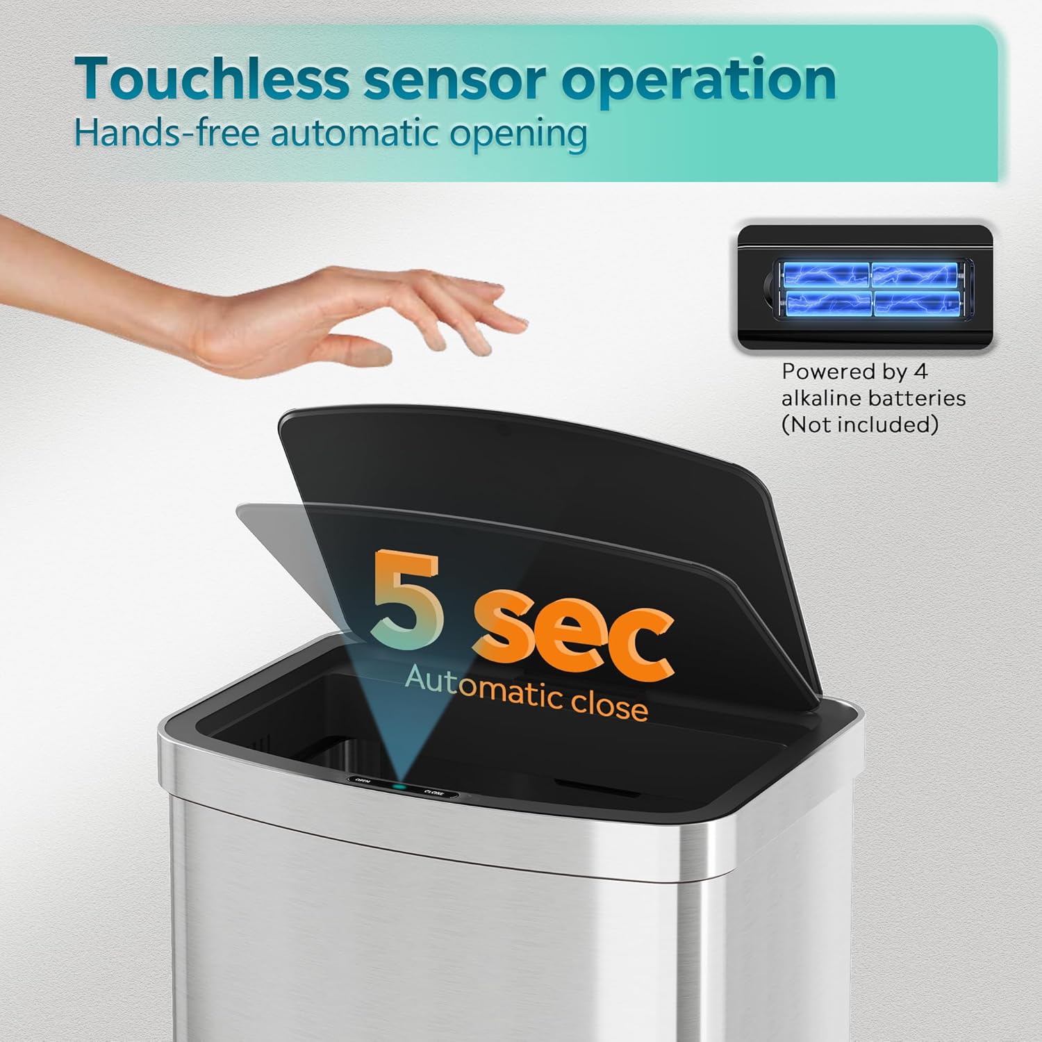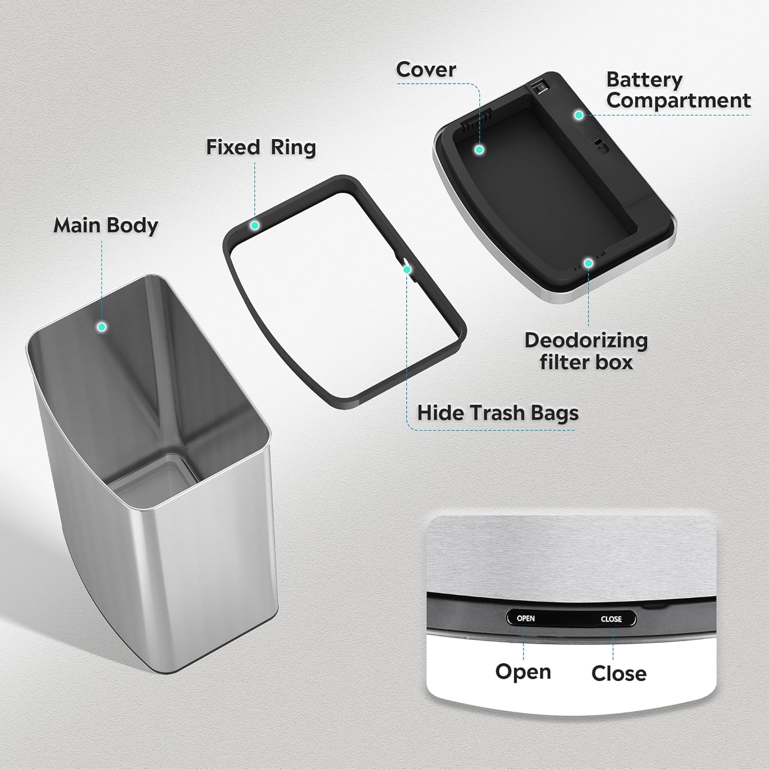 - Sleek & Smudge-Proof: Crafted with anti-fingerprint stainless steel, this touchless garbage can resists smudges while maintaining a sleek, scratch-resistant finish. Durable and visually versatile, it blends effortlessly into any decor.
