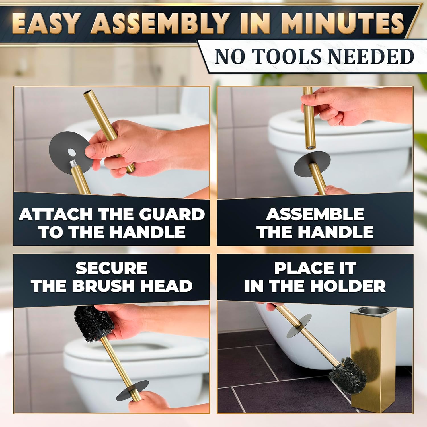 - Bathroom Toilet Brush Set With Splash Protection: Featuring a protective cover on a brushed gold toilet handle, our toilet brushes for bathroom with holder shield your hands from stains