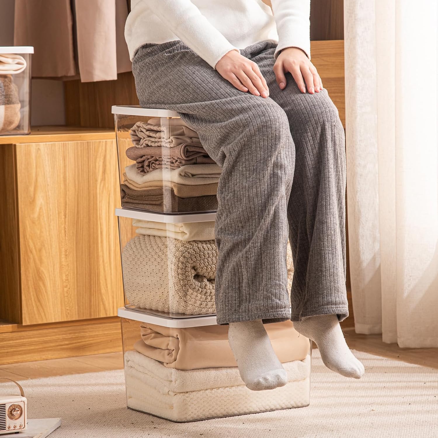 - 4. These large storage boxes with lids are perfect for sorting and storing clothes, food, shoes, toys, books, scarves, and more. Providing dust protection, the stackable design will fully utilize your closet or other space.