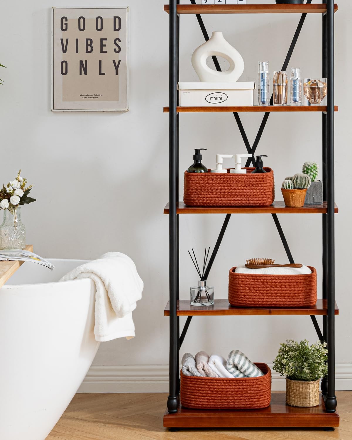 - [ Elegantly Designed to Match Any Décor ] Our small rope basket creates a minimalist appearance, and it adds a touch of warmth and texture to any room. The classic solid color design ensures seamless integration with your existing aesthetics, complementing any decoration. Perfect as decorative storage baskets for shelves, cabinets, and any open display space, making them a stylish and practical addition to any decor, enhancing the overall aesthetics of your room