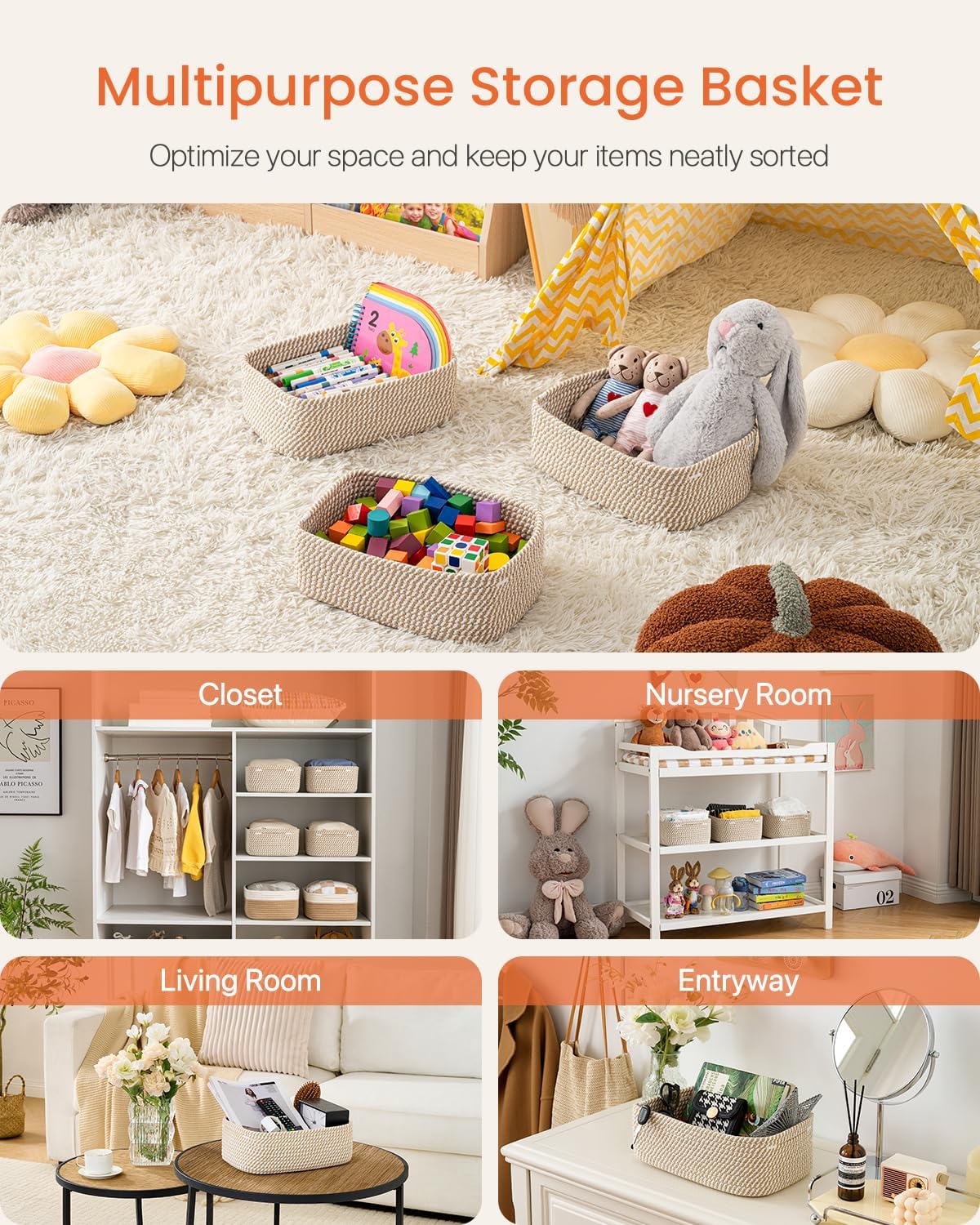 - [ Elegantly Designed to Match Any Décor ] Our small rope basket creates a minimalist appearance, and it adds a touch of warmth and texture to any room. The classic solid color design ensures seamless integration with your existing aesthetics, complementing any decoration. Perfect as decorative storage baskets for shelves, cabinets, and any open display space, making them a stylish and practical addition to any decor, enhancing the overall aesthetics of your room